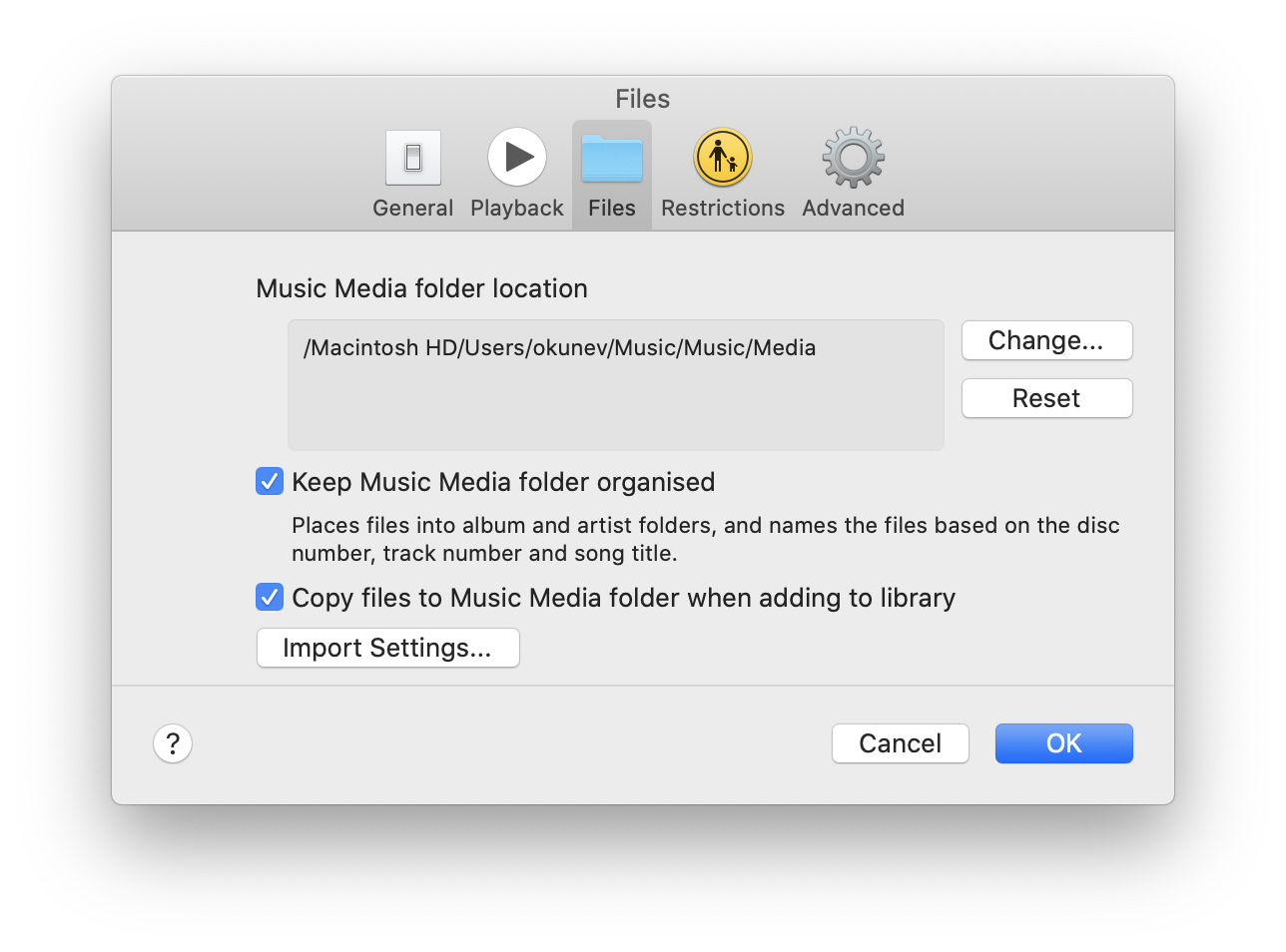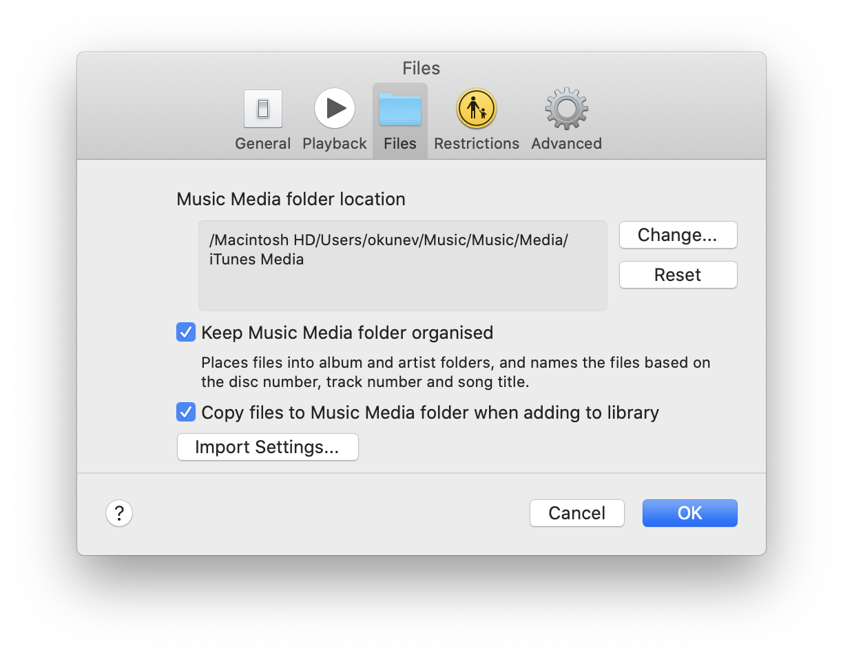 • I copied the backed up iTunes library into ~/Music (Home folder → Music).