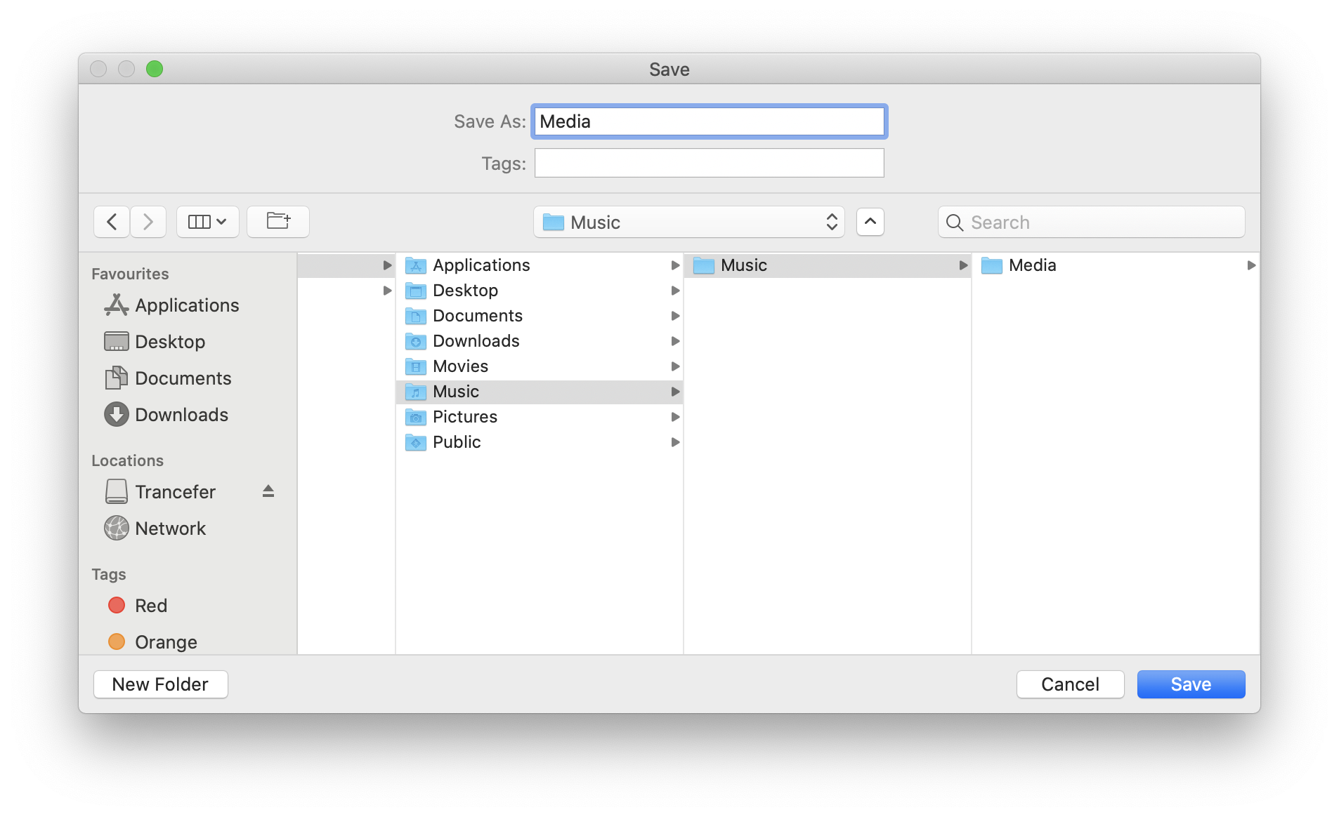 Make sure you select "Music" with your cursor and type in "Media" under "Save As" – this is the way to work around this thing if you want the new library file to be saved to the root of the "Media" folder. It prompts you to overwrite "Media" as it already exists – agree to that.