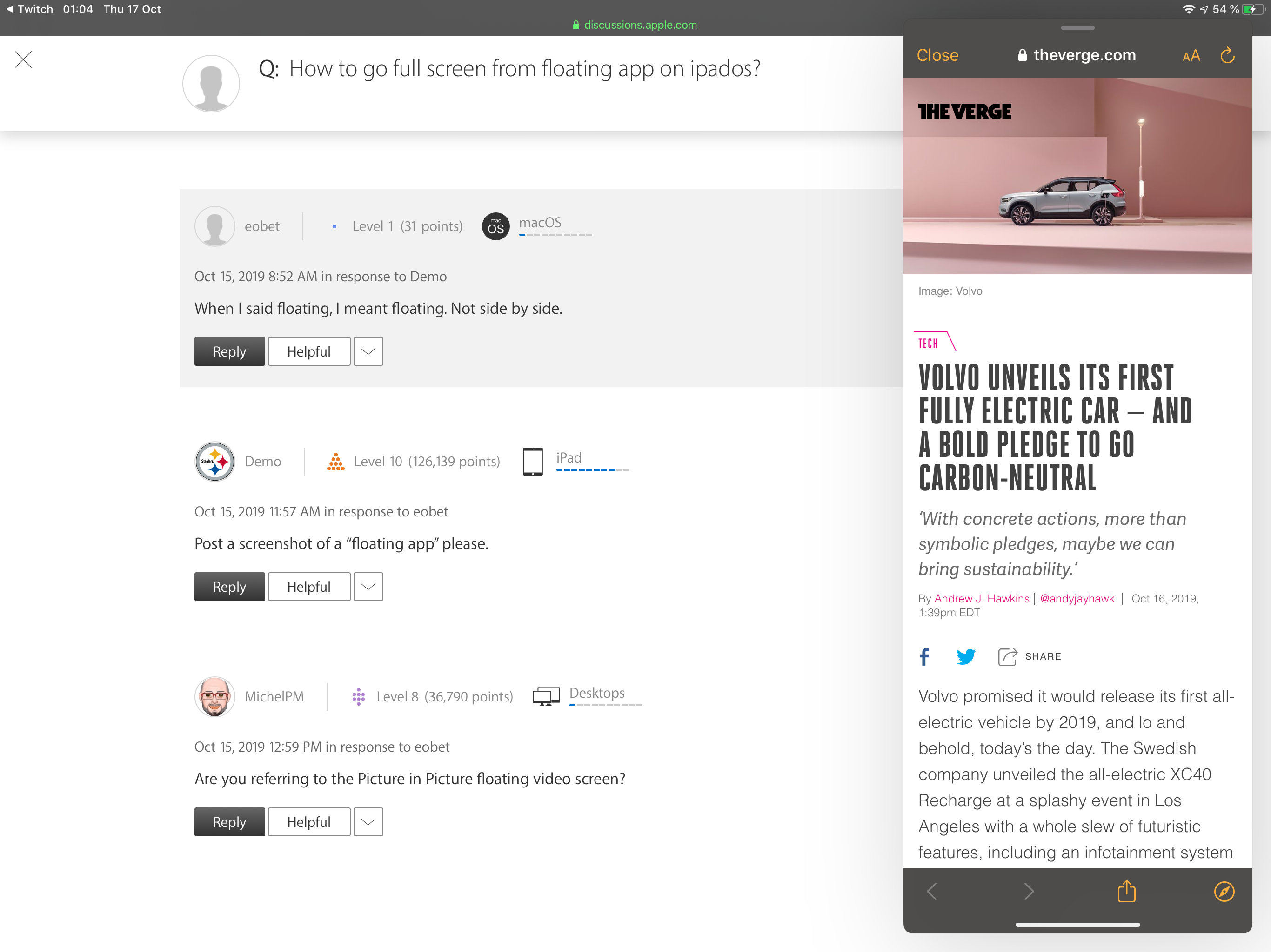 How to go full screen from floating app on ipados?