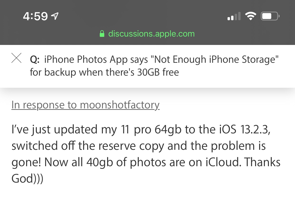 I have iCloud enabled to upload my photos but it is stuck uploading and the message "Not enough iPhone storage" is shown. I however still have 2.3GB storage available on my device.