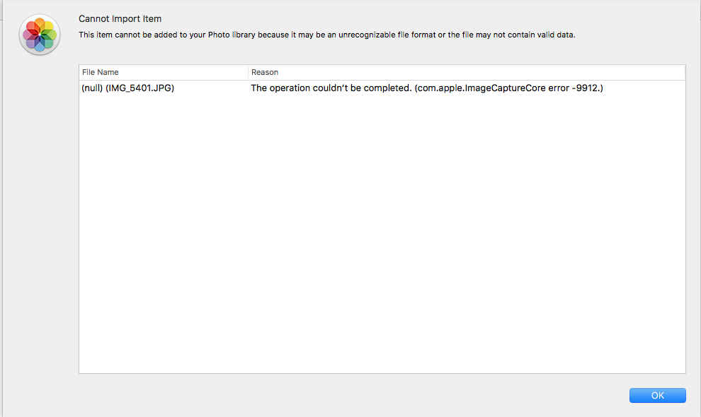 Has anyone else been able to solve the import error -9912 in photos? I have tried updating computer and phone, as well as toggling back and forth between "transfer to mac" settings. I cannot download the last (roughly) 6 months of photos on my phone and was hoping for a solution. Running photos 2.0 on a iMac and 13.1.3 on an iPhoneX. Would like to know if it is a phone problem before I continue to use it to take pictures. If it is a photos problem, then can anyone suggest an alternative? (Migrated from iPhoto a few years back)