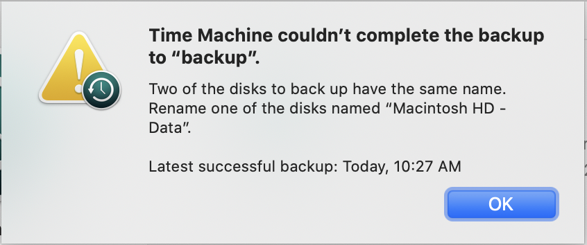 I have the same problem. There are two Data discs. I can't back it up until I rename one of the discs.