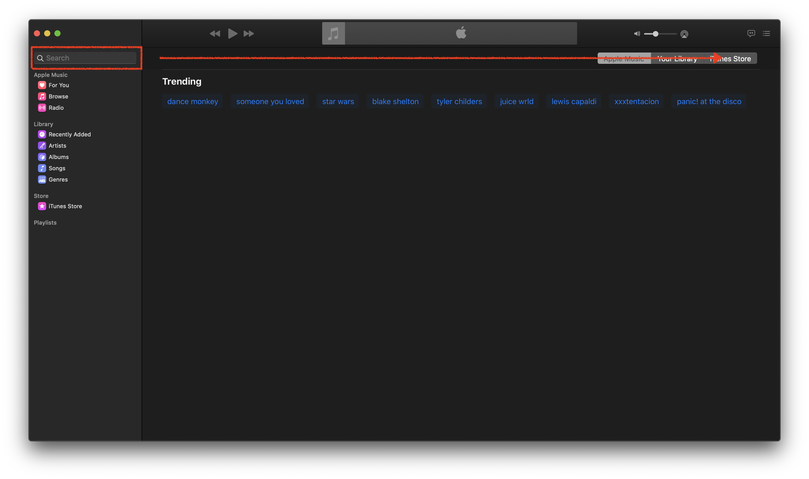 I'm on Catalina on my MacBook and have the new iTunes. When I go to the iTunes Store there is no search field. How do you search for music?
