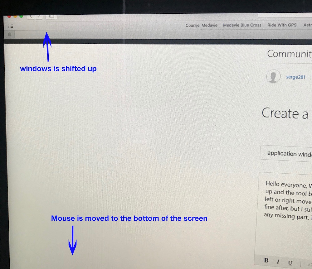 Hello everyone, Whenever I move the mouse to the bottom of the screen the opened window my iMac shifts up , when I move the mouse to the top, the window shifts down. Same with left ( windows shifts right) or right movement of the mouse. I had this problem yesterday and I rebooted and everything was fine after, but I still have the same problem now. A screen capture shows the complete window without any missing part. The images included where taken with my iPhone. Any ideas, bug? new strange feature? thank you