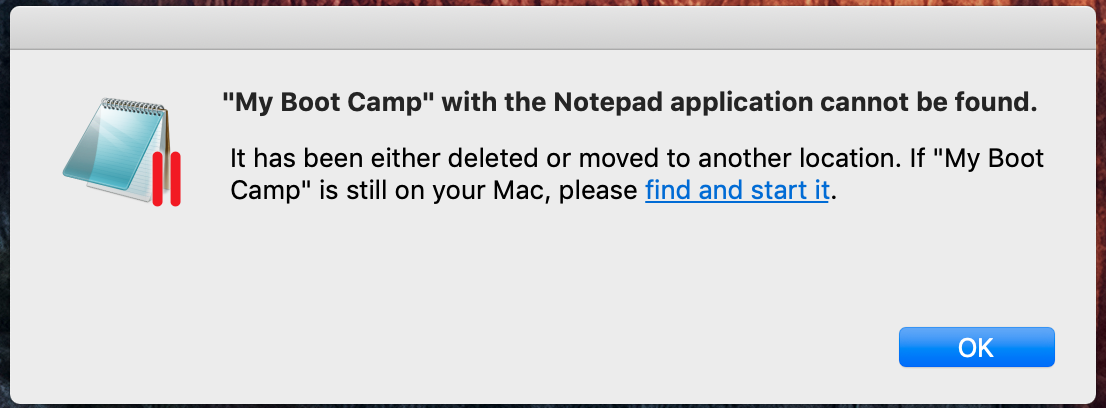 When I click on the “Find it ….” line, it opens Parallels.com on the web, which is useless. The OK button simply dismisses the window.