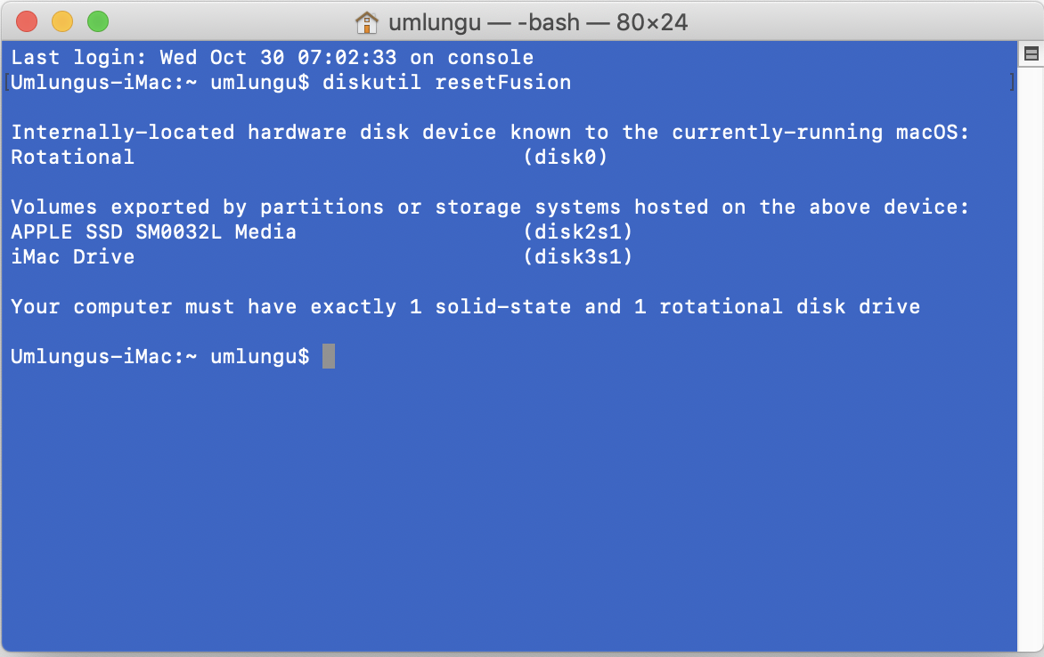 - Type diskutil resetFusion in the Terminal window, then press Return.