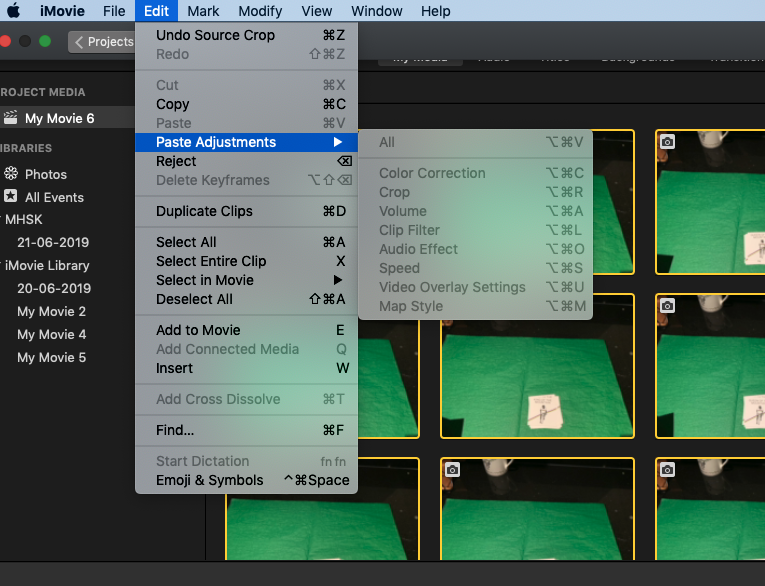 I cropped a photo and want to apply the crop to all the other photos in my iMovie project. I selected the photo, then 'copy', then selected the photos to apply this to with cmd, but edit > paste adjustments is greyed out. Pls could you help me troubleshoot this problem?
