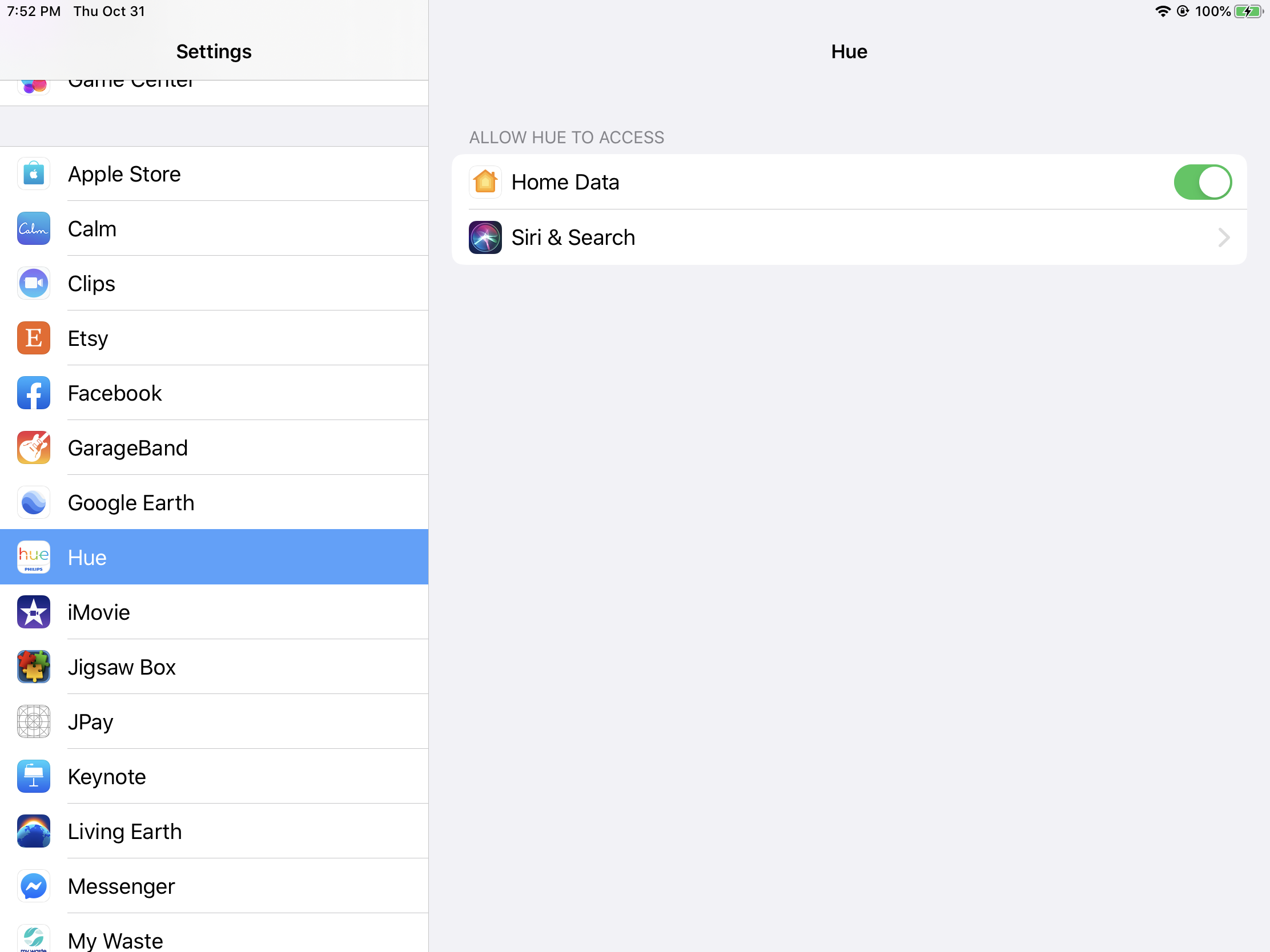 • on your iOS device you need to allow Home Data for the Hue App, like this.