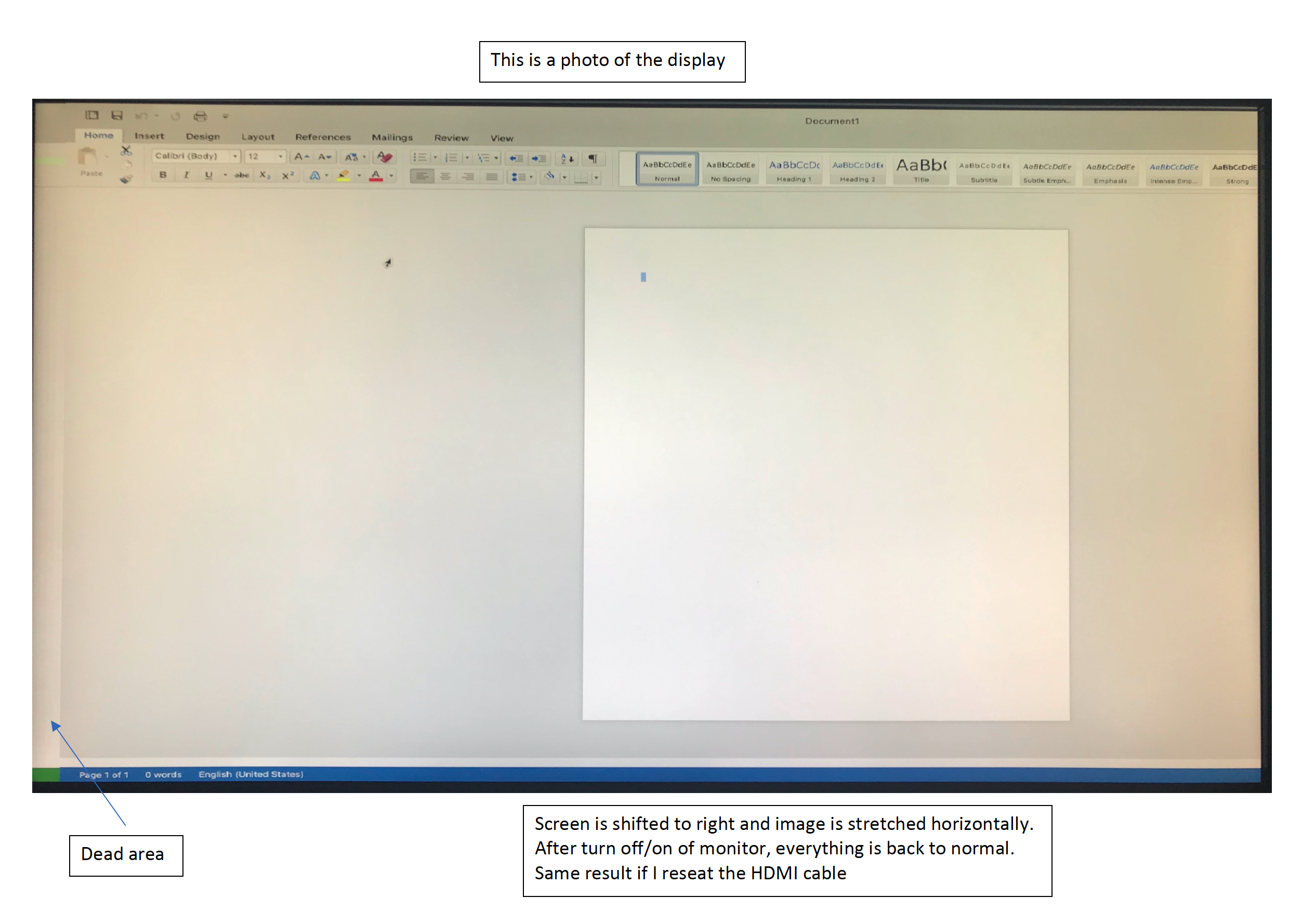 My 2018 mac mini with Catalina 10.15.1 after waking, the screen is shifted off to the right with a 1/2" vertical dead space on the left side of the screen. The displayed information is also stretched sideways. If I power off the monitor then turn it back on it comes back to normal.