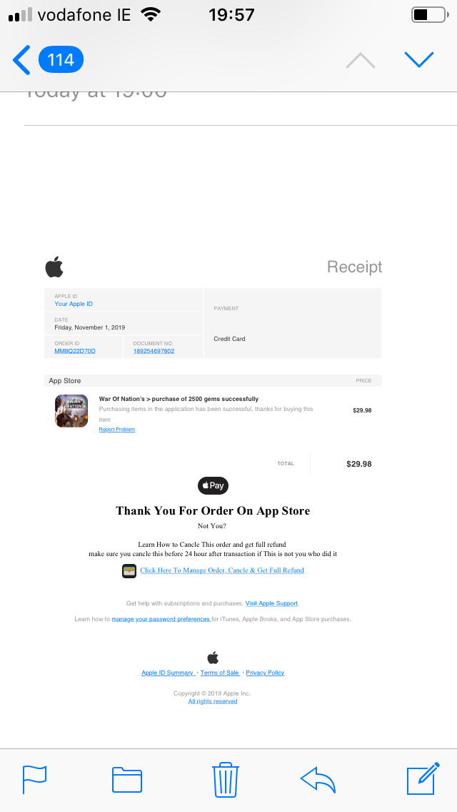 Did apple send me this? My purchases usually show in euro not dollars and nothing has been taken from my bank account so I’m guessing this is just a scam email. Can you help?