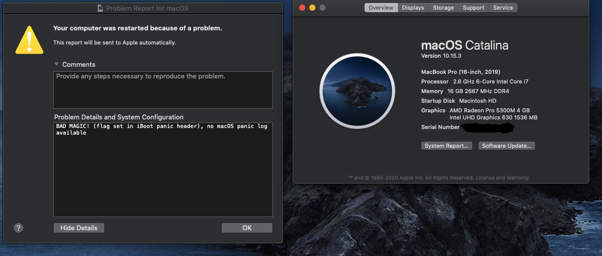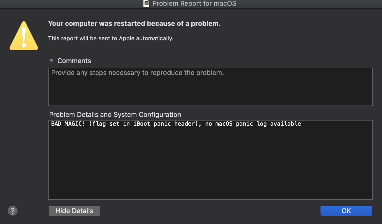 Whole story is here mark my words, I did a lot of research on this. The issue is due to Apple placing a non x86 command set ARM based T2 chip in between intel processor and SSD. (This happened in 2018. Any unit bought after this date is a candidate of this hardware/software error.) To conduct the command translation, they wrote the Bridge OS. Before Catalina I was getting Bridge OS kernel panics with my macbook pro and imac pro. With Catalina it has turned to “ BAD MAGIC” error.