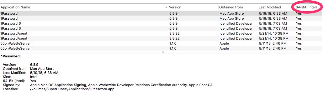32-bit app compatibility with macOS High Sierra 10.13.4 and later - Fairly complete FAQ - https://support.apple.com/HT208436