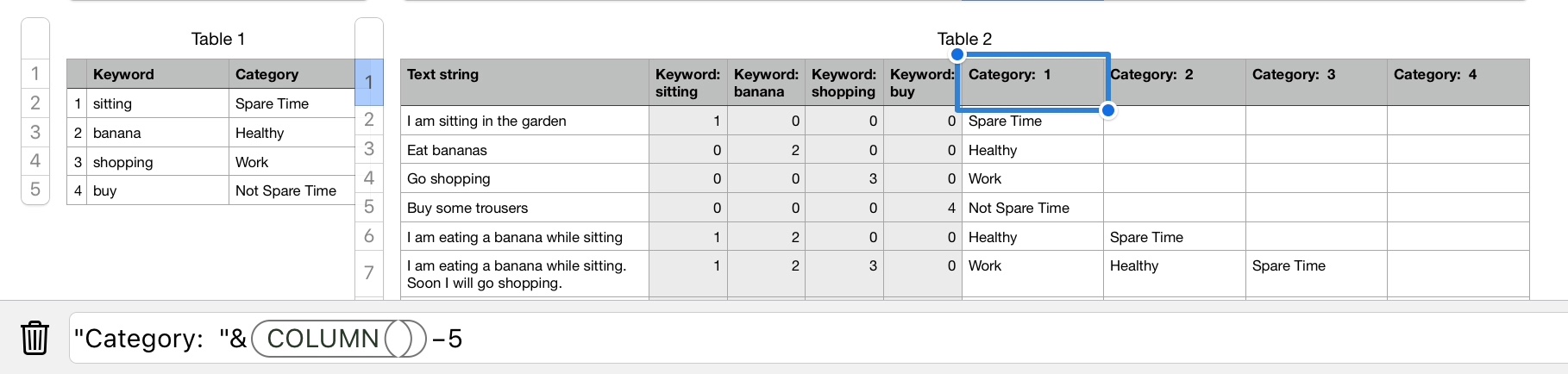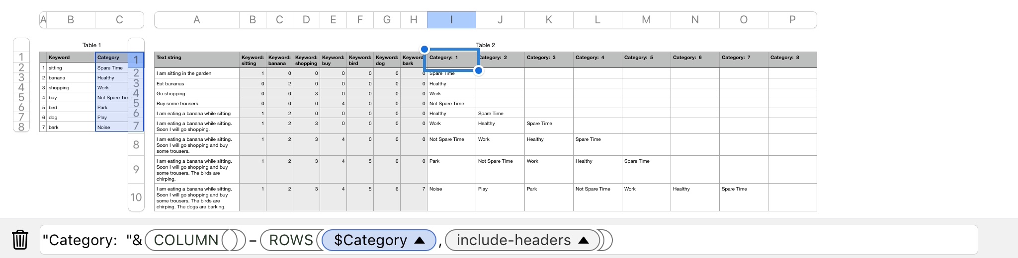 Col2: Categories (the categories assigned to the keywords - if they are in the first table in Col1)
