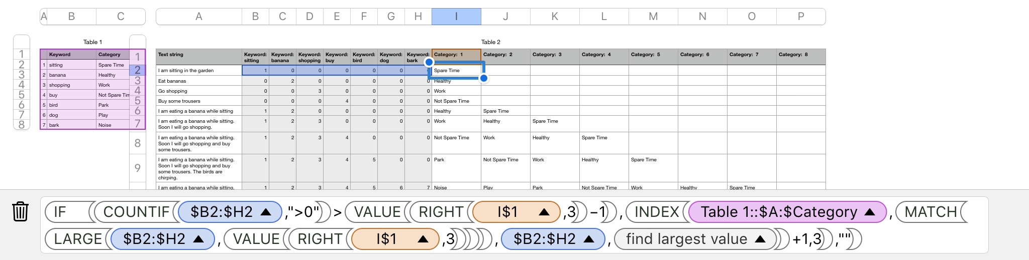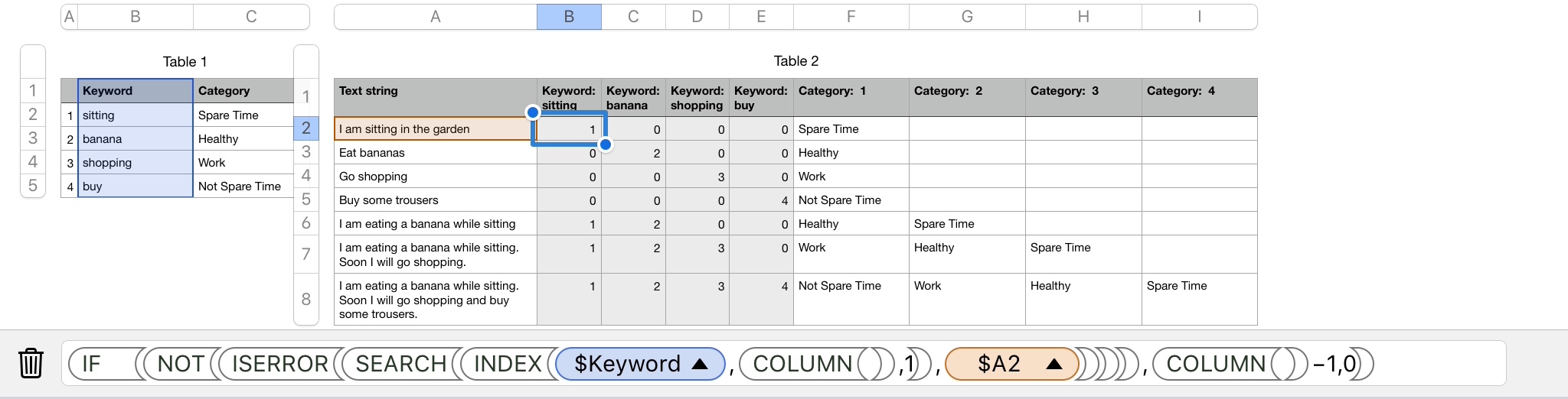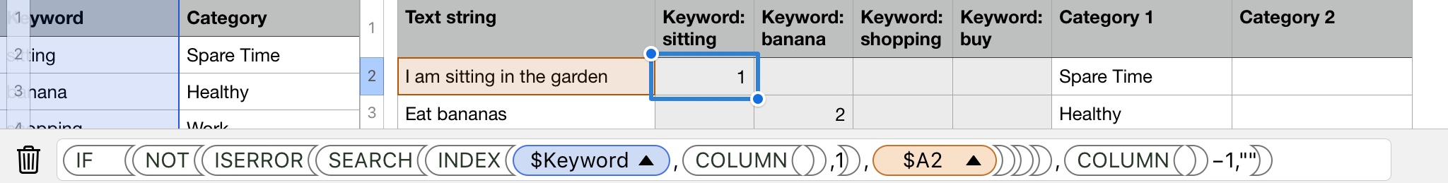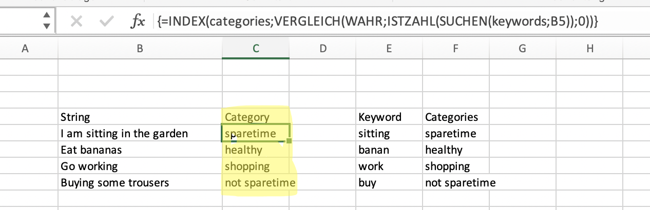 I would like to assign a category to identified keyword in a string and found a solution for excel. Now I am trying to find a way to "convert" the array formula to somewhat that works in iWork numbers as well.
