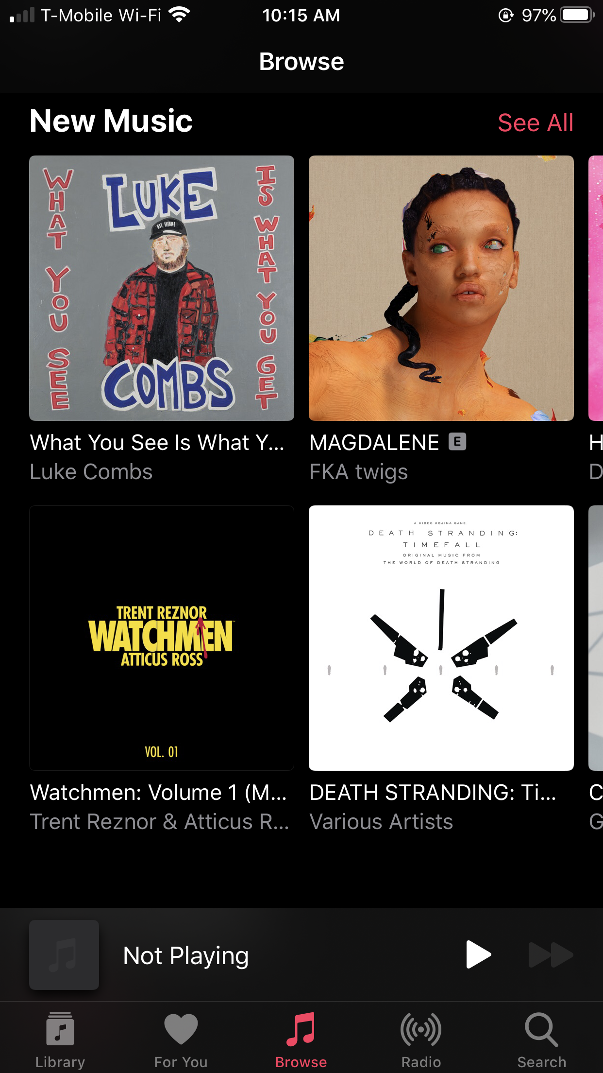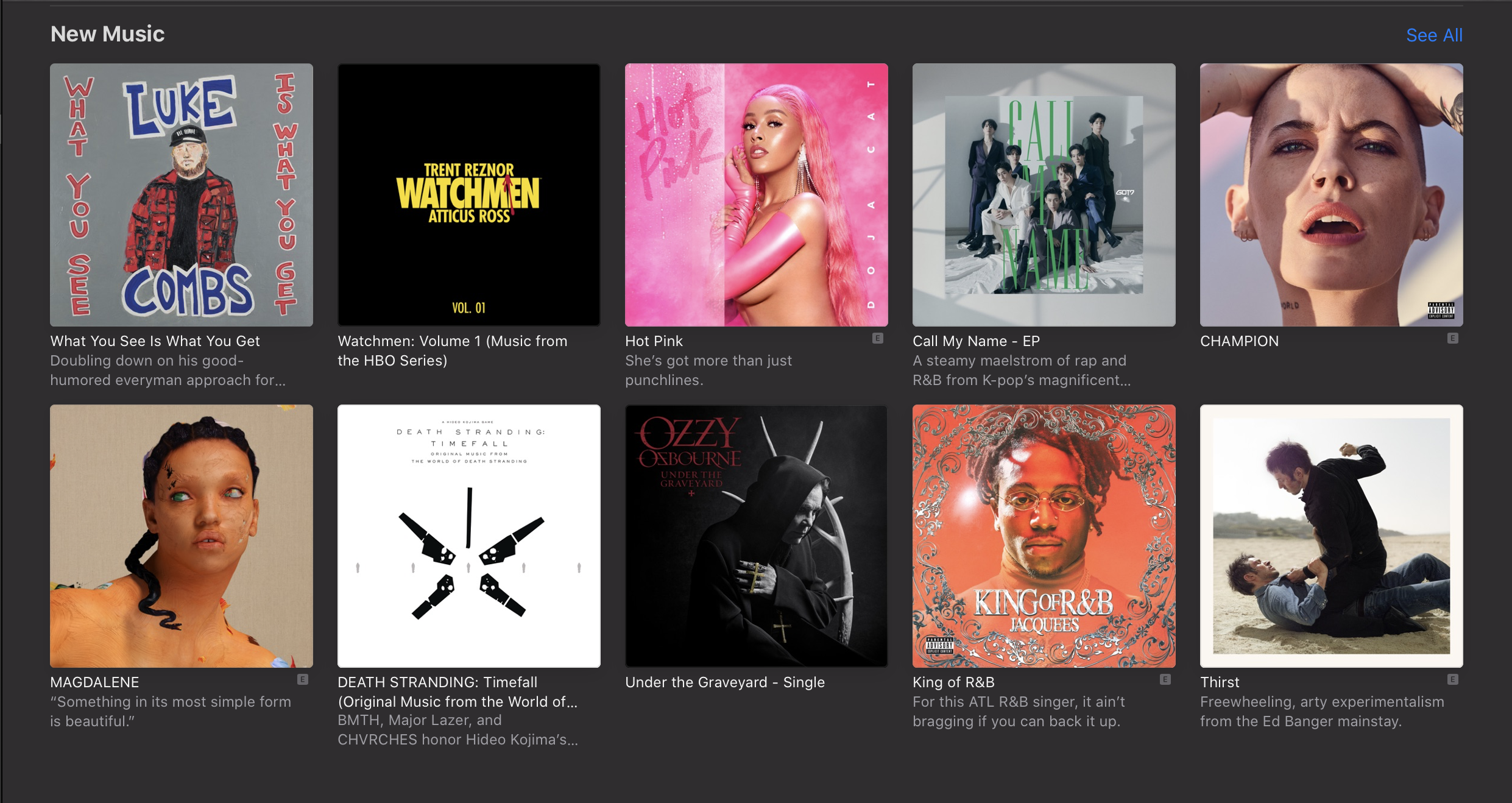 When I'm using the Music App on the "Browse" tab navigating to the albums listed under New Music, none of the Artist names show. It only displays the cover art, album name and an excerpt of the album description, no artist name. So unless the artist has their name in the album artwork or you recognize album name, you've no idea what the artist is until you click into the album. On the Music App of iOS, it shows the artist name with each album, instead of the description excerpt.
