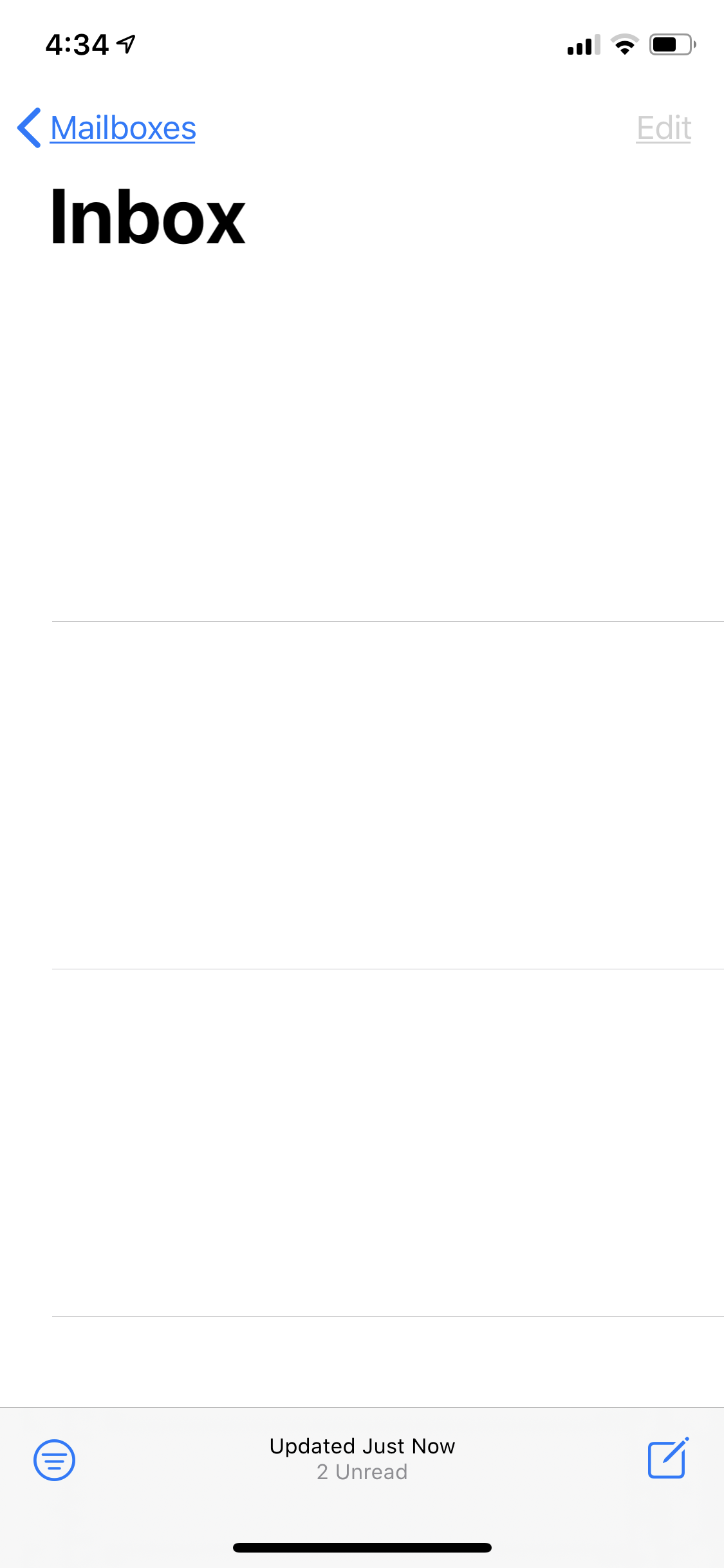 But open the INBOX and this is what you see (it’s blank except at the bottom of the screen where it shows 2 Unread email.
