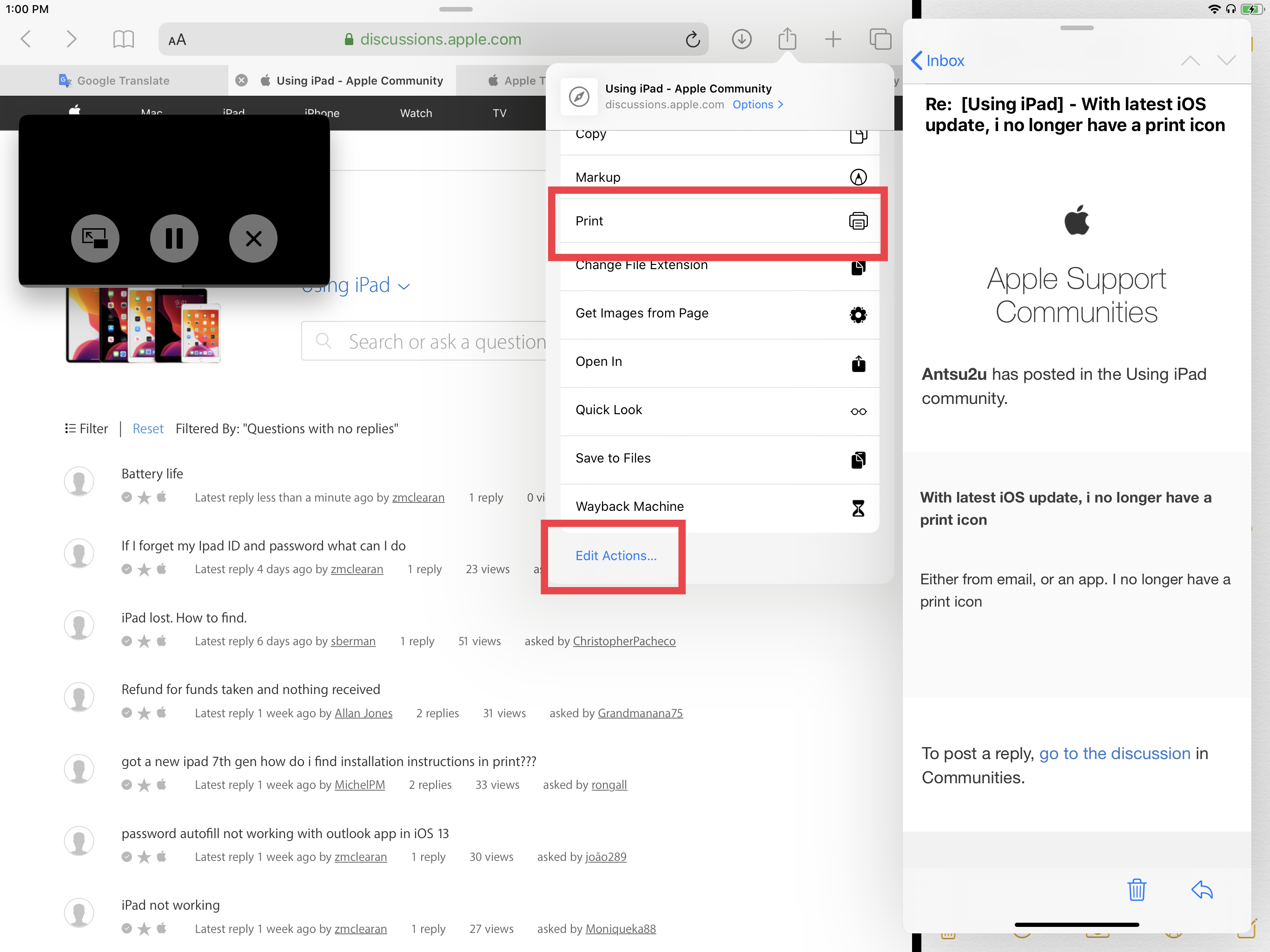You may need to scroll down to view the print action or you may need to add the print action to the list of options by tapping the “Edit Actions” button on the bottom of the share sheet.