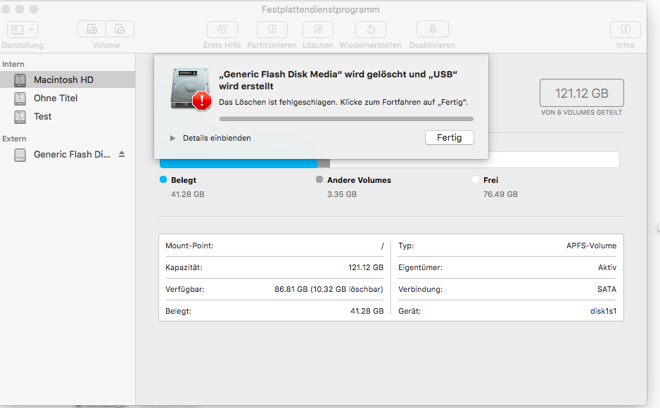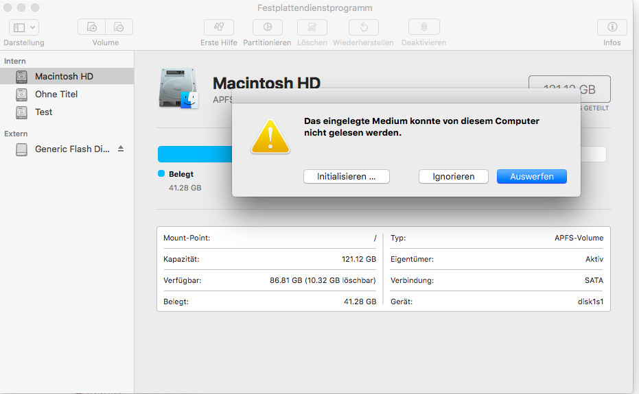 I have some problems with my USB drive. When i plugged in the Disk utilities shows me only the Generic Flash Disk Media. The USB stick is new and everything worked fine until i tried to partitioning and additioning some volume.