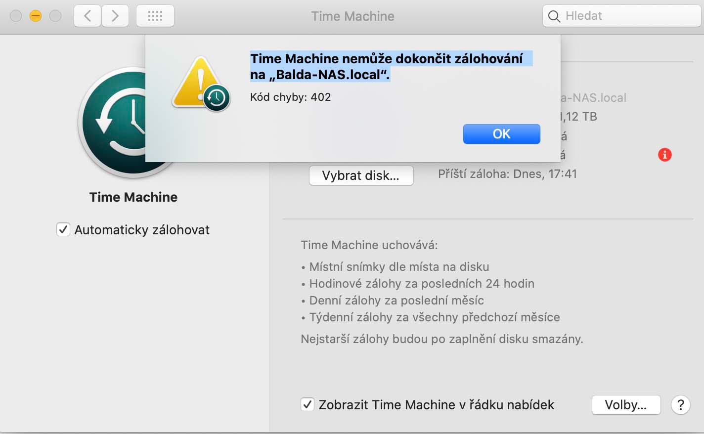 I have trouble with TimeMachine on my NAS Synology Disk. TimeMachine start as normally but never finish without error. Error 402. Can you help me to fix it? Thanks