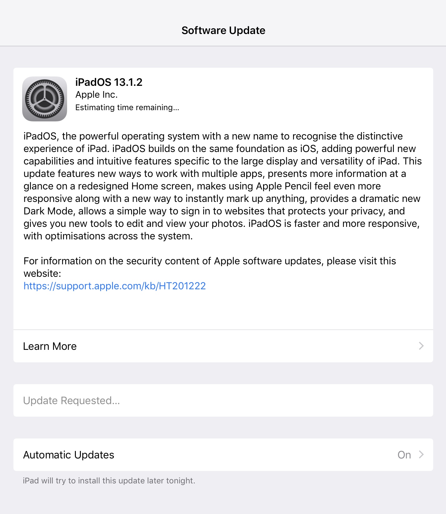 My iPad is telling me there’s a software update for iPad OS13.1.2. However, when I go to update, there is no way to initiate the update (there’s usually something along the lines of ‘update now’ which you can select). It says ‘iPad will try to update tonight’ but it has not update overnight. The iPad was connected to power and WiFi all night. I’ve tried closing the app, restarting the iPad etc and no change. There’s also just the ‘estimated time remaining’ at the top which hasn’t changed in about 2 days.