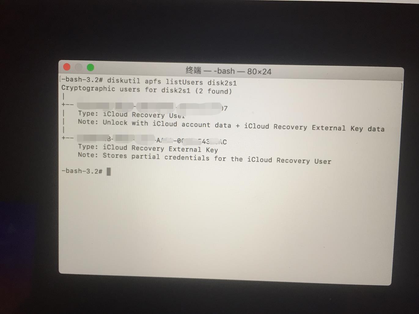 3) tried diskutil referred by online solutions (1, 2, 3). the problem here is there is not any things like personal recovery user. there are two Cryptographic users found: