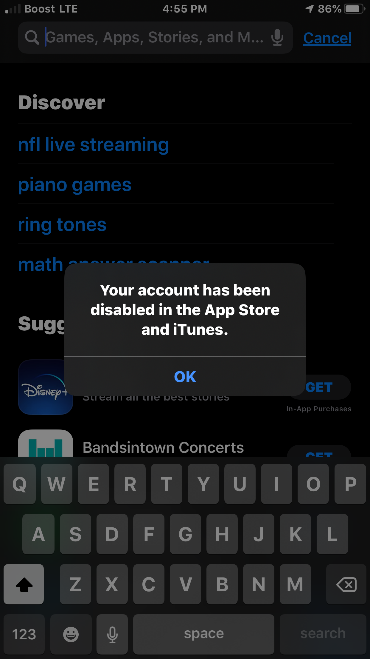 According to: If you see a message that says 'Your account has been disabled in the App Store and iTunes' - Apple Support