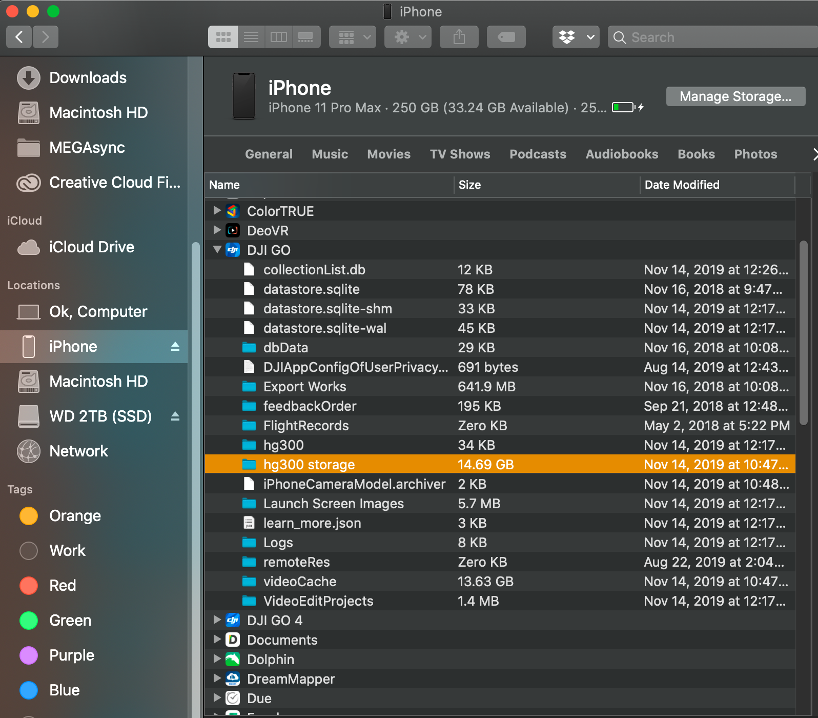 I recently upgraded to Catalina. My iPhone 11 Pro Max is connected to my MacBook pro via USB. I pull up Finder, and select "Files" from the iPhone tab and go to the DJI GO app folder, and drag the shared files folder to my desktop. Upon dropping the file to the desktop - it stays for 1 second, and vanishes.