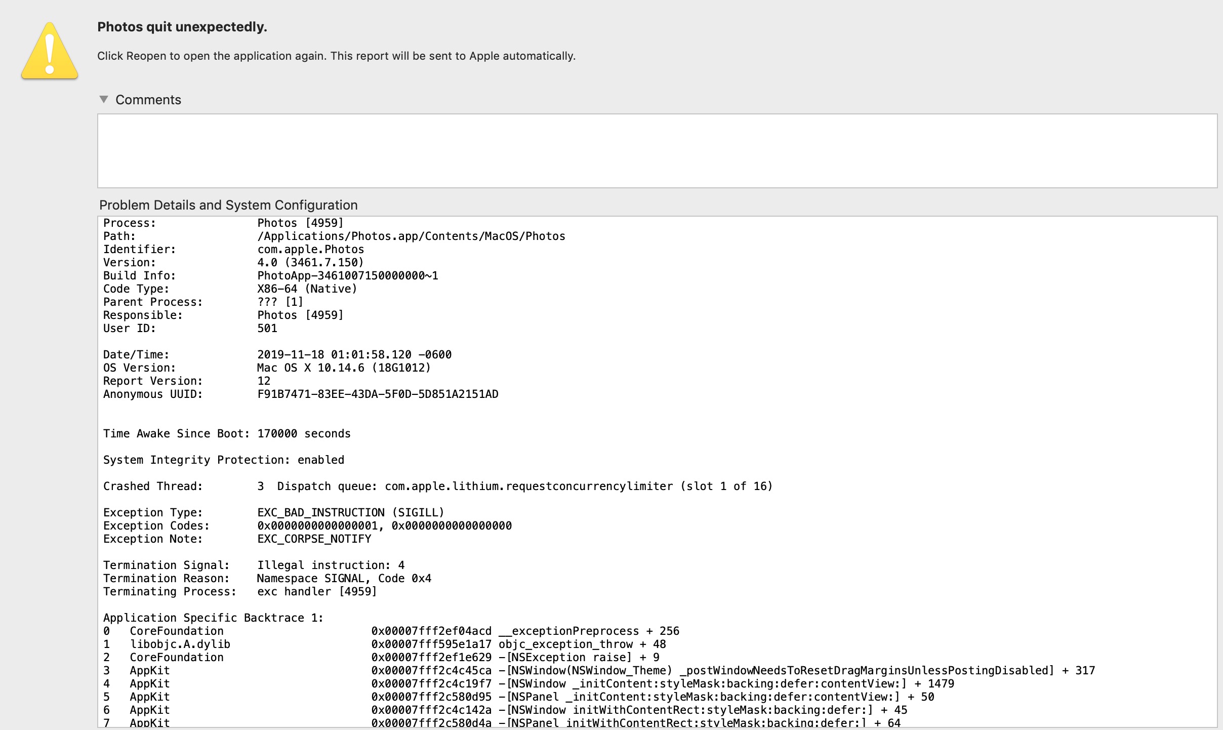 I have a large (550GB) Aperture library. Every time I try to open in Photos to migrate the pictures, Photos crashes. I have already tried the following: