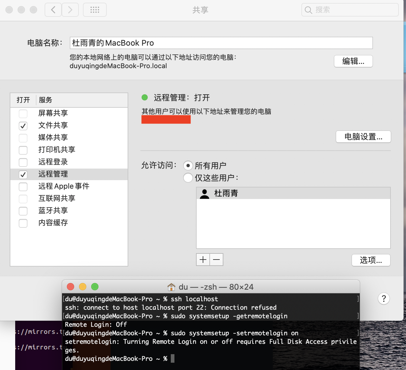 错误提示为setremotelogin: Turning Remote Login on or off requires Full Disk Access privileges.