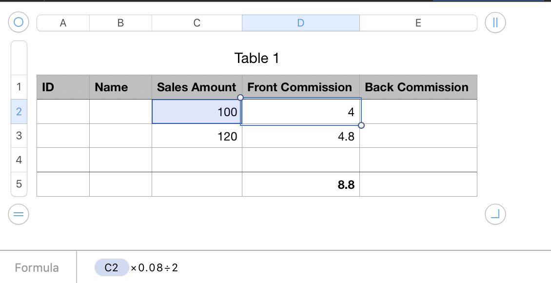 The formula I want is this: The formula will be in D-Front Comm to read as =sum C10(sales amount)*0.08/2 The problem I keep having is that Numbers changes the C10 (sales amount) in the formula to A10 (Job ID #). It is then calculating my commission on the Job ID# in Column A and not the Sales Amount in Column C. I used this in Excel for many many years, This has me stumped. HELP!!! Thanks. Pam