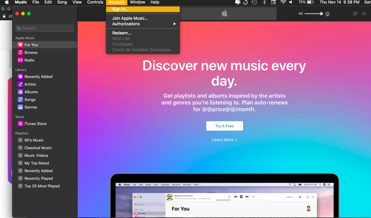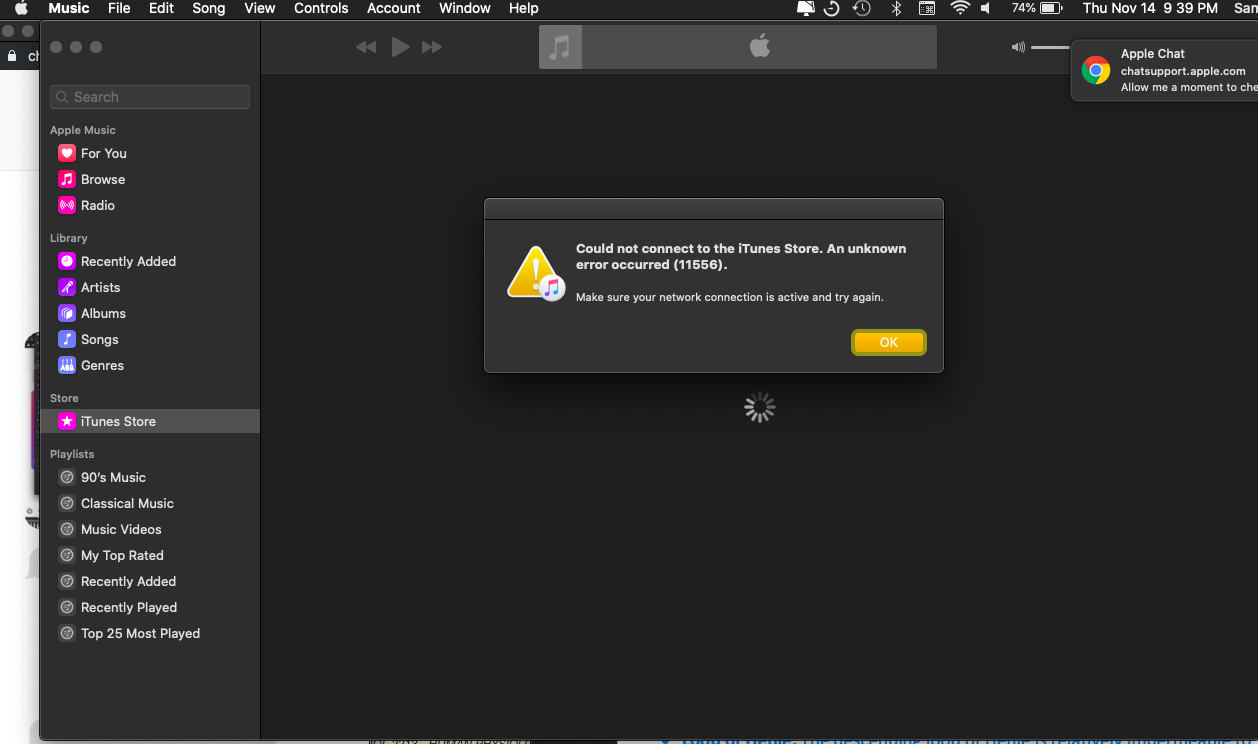 I recently updated my Macbook Air to Os x Catalina and I am now having numerous issues with Apple Music app on my mac. I can readily access Apple Music on my iPhone 11 Pro Max and my iPad Pro without having any problems arise and they are on the same Apple ID. I can no longer access the "iTunes Store" column in the left side of the app, it just tells me that there seems to be no internet connection. I am 100% connected to the internet every time I try to open it, as I can search through google or access Blackboard assignments without any connection issues. I have tried it on multiple wifi networks in my house and multiple wifi networks at friends houses or at school. I can no longer access the "For You" column in the Apple Music app. It shows me a "Try Now" screen but when I click it, a popup screen appears but nothing ever loads on it and I have to force quit the app to try to open anything else on the app. I have gone to the menu bar while in Apple Music and clicked "Account", "Sign in", enter my log in information, and it doesnt do anything. When you click on it again, it was like I never tried to log in in the first place. My Apple ID email and password are not entered incorrectly, as it doesnt show me any wrong email/password notification and whenever I purposefully enter a wrong password, it does give me that notification. I never had this issue before updating my Mac. I have been on countless chats with agents that try to help me solve the issue, then transfer me to another guy who tries to help me solve the issue, who transfers me to another guy who says he is going to call me and never does, and so on. I am not too sure how to approach this problem, as I dont really understand what these error messages are saying. The only resolution I can think of would be to delete Apple Music app from Macbook and restore it... but I'm not sure how to do that, or if you can even delete built in apps on a Macbook Air. I have attached all the error messages I have received below for reference. PLEASE HELP!!!