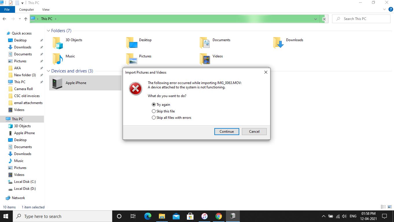 Hi there! I’m about to loss my mind. I’ve been having this problem for far too long. Every time I go to import my photos from my iPhone 7 onto my windows 10 Acer laptop it begins to import my photos via the windows photo app, but then disconnects after importing 8 or less photos (sometimes doesn’t import at all). I made sure that I have the device driver up to date on my iPhone, and the cord I’m using works just fine. It connects to the computer, it just doesn’t import my photos. Please help :(