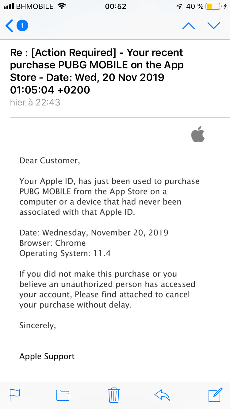 Hello, I have just got the mail from AppleID, email adress (appleid@id.apple.com). This email was sent to another person on email adress (mailqueue10092-shoplifter@shopping.com). There is an attachment which I haven’t opened yet since all of this looks like some kind of scam. I hope I’ll get response soon.