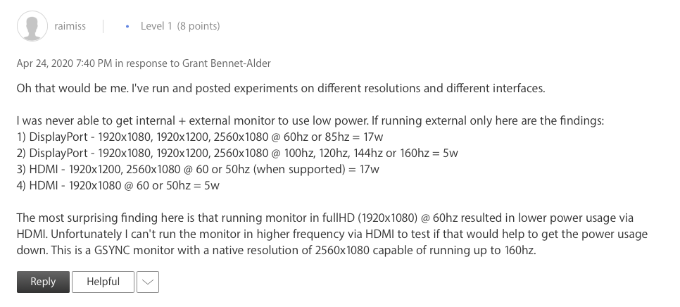 For anyone who is lost in those endless pages of comments, read raimiss’s comment that I have screen shot below, try adjusting refresh rate accordingly, notice if there is a significant temperature/wattage increase when using refresh speeds lower than 100Hz or during non clamshell mode, then contact Apple Support to inform them about this inconsistency. I have tried all combos of raimiss’s ( except for 160Hz and 85Hz ones because of my monitor capabilities), and all of his findings apply to mine. 2560x1440 gives the same result as 2560x1080 as well. Not sure about 4K monitors since I don’t own one.