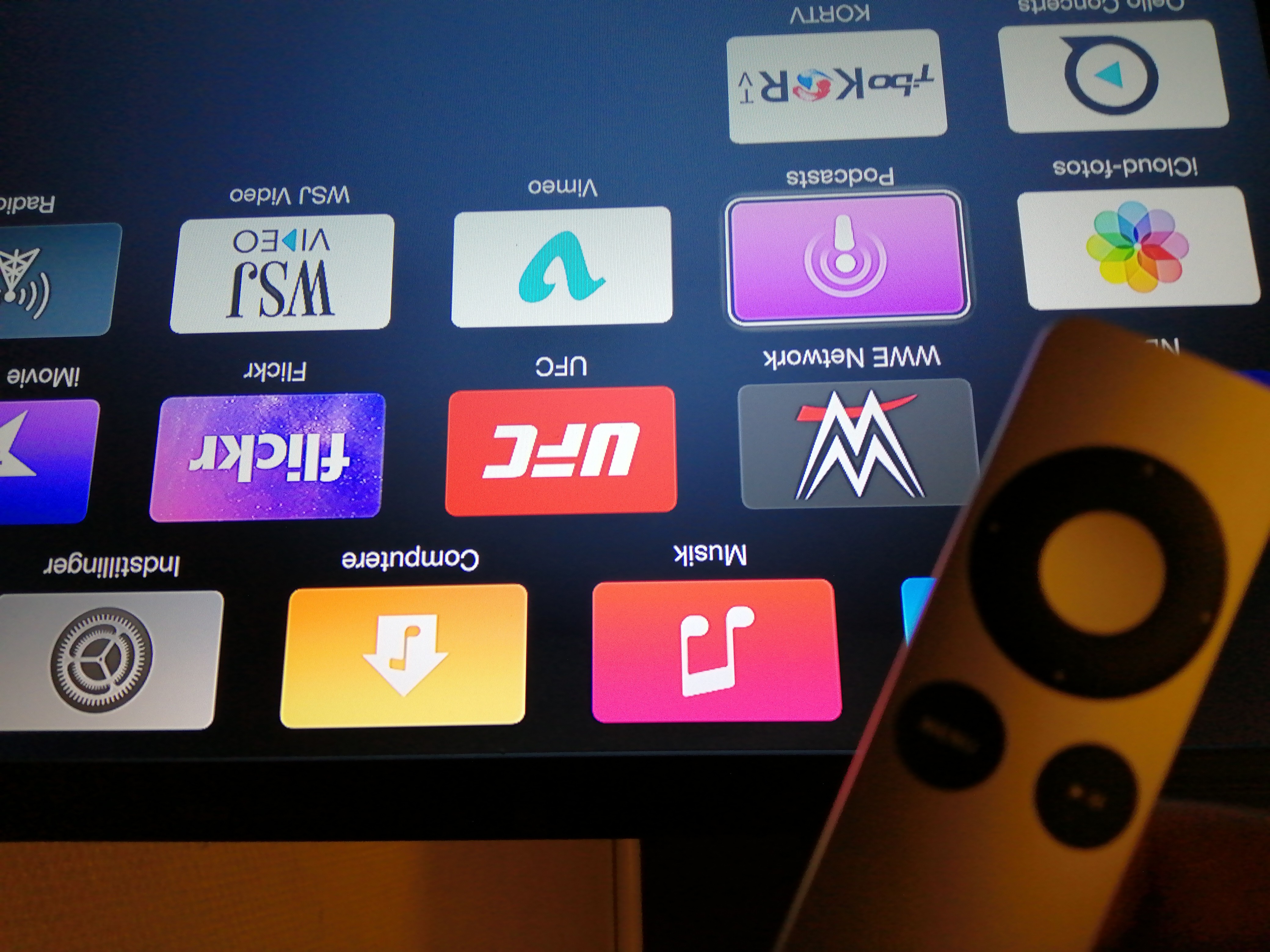 It looks like your TV is upside down, not the Apple TV’s screen.