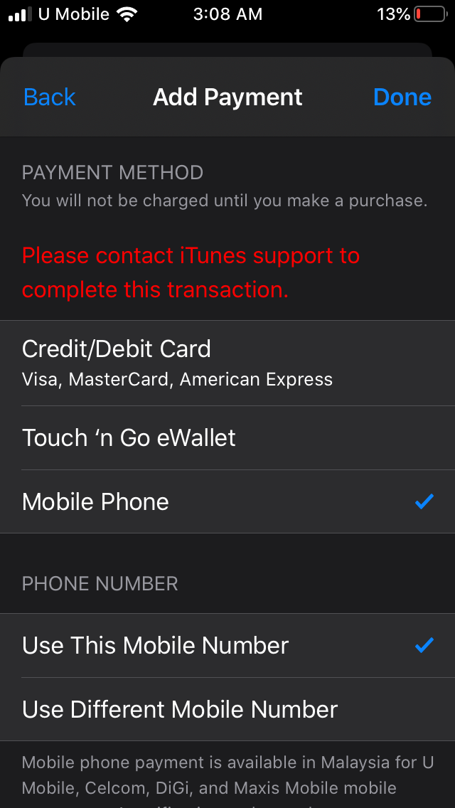 After I fill the mobile number payment method form,it kept saying “please contact ITunes support to complete this transaction”. It works before but when I change my Apple ID this happens. I’m starting to get annoyed since I can’t purchase any apps..