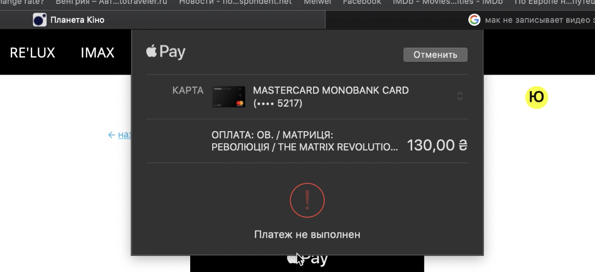 Показывает окошко эпл пей, пытается оплатить, но в итоге показывает ошибку.