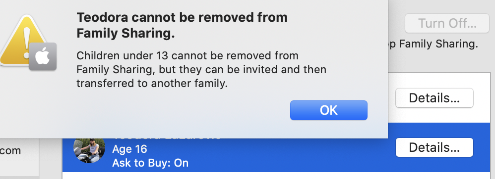 I am unable to remove Apple ID child account from my Family Sharing because of this bug. On image you can clearly see that age of my child is 16. But still for some reason I get this warning that prevents me to manage family member.
