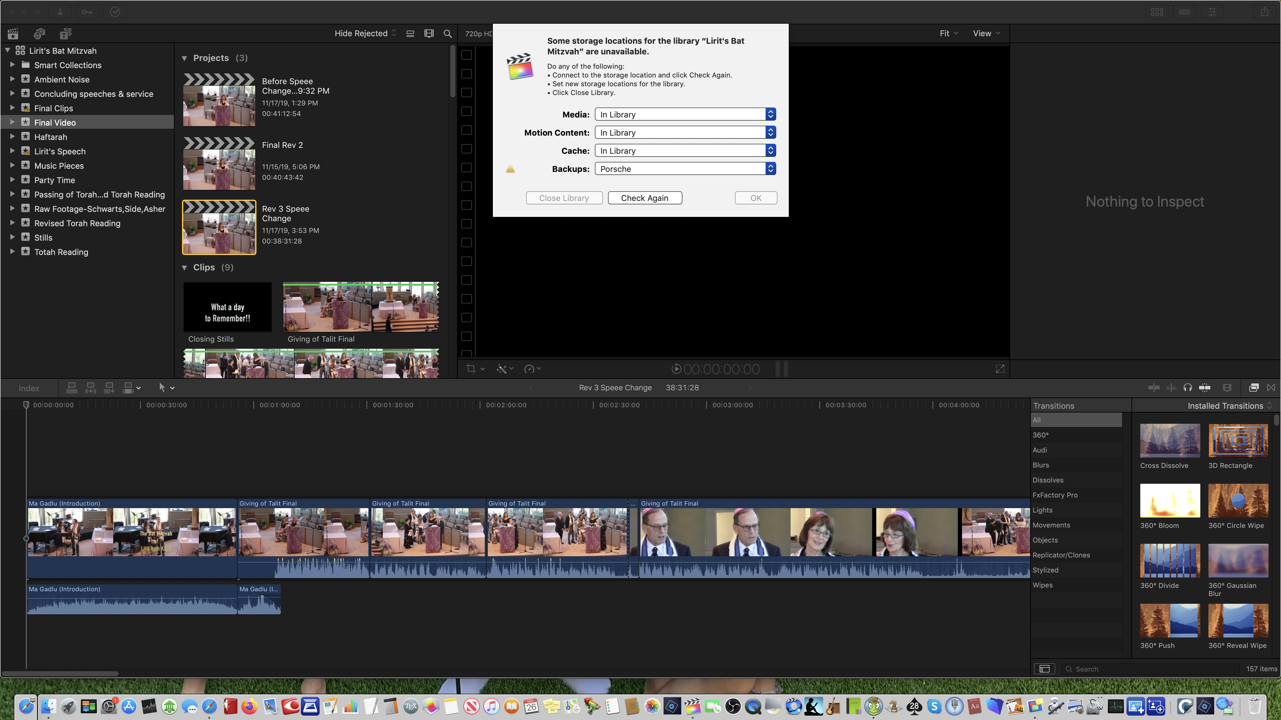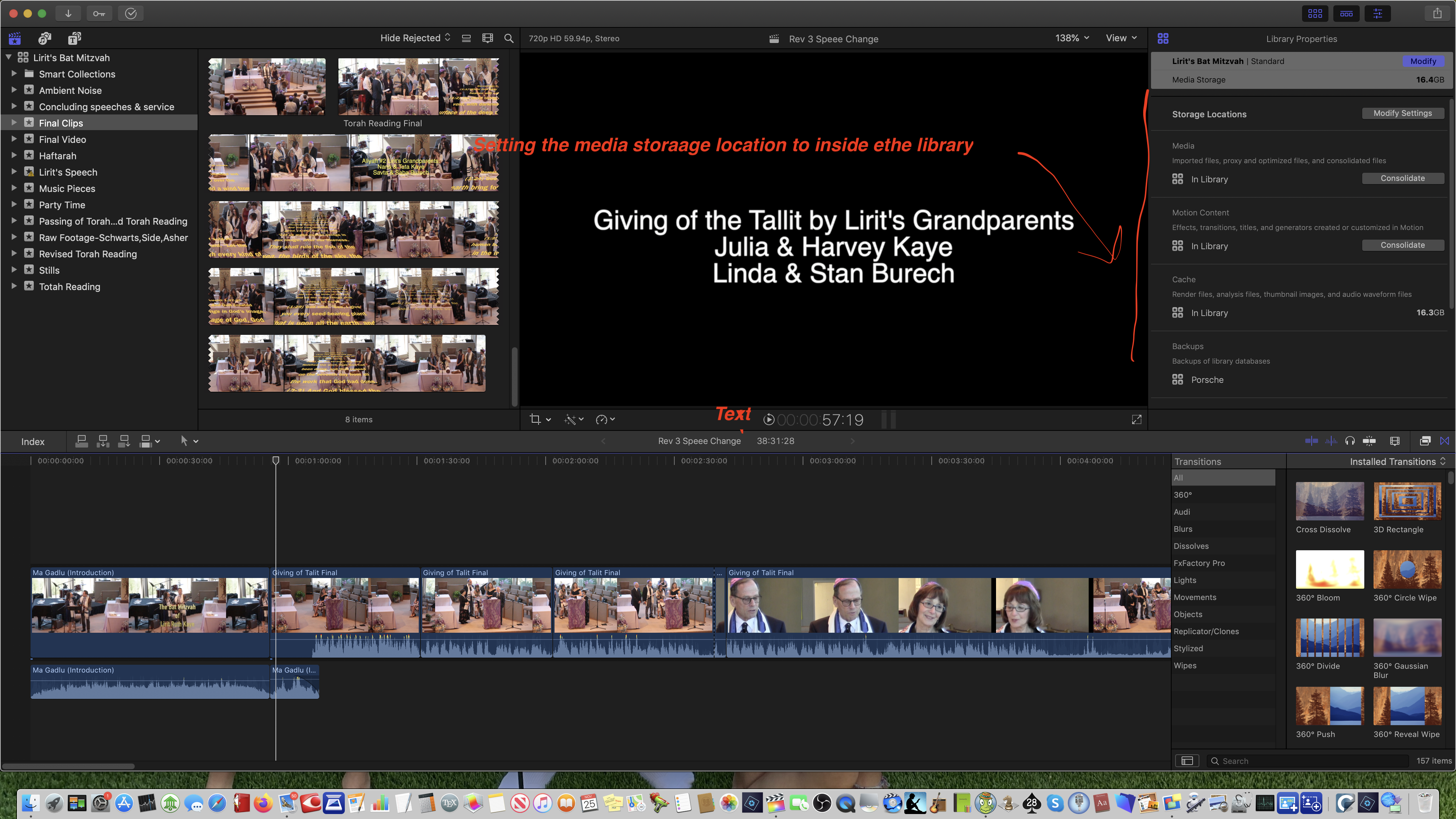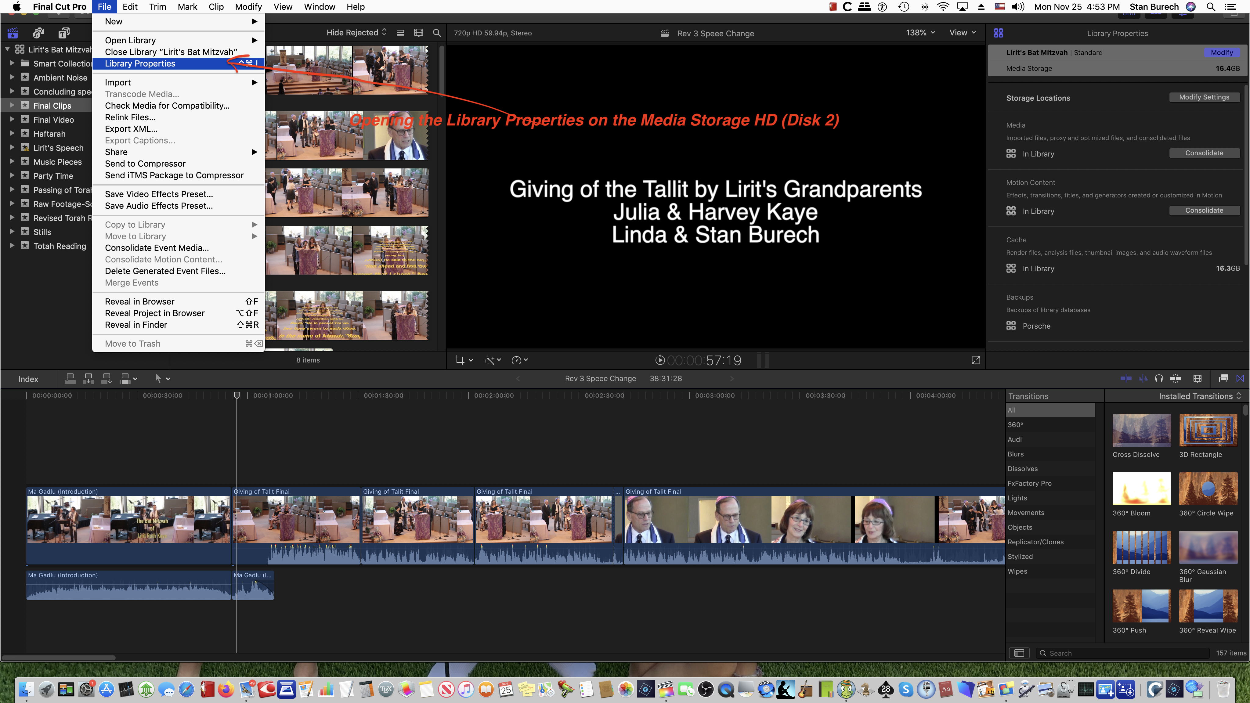 Photo 6 shows the opening the library on the Media Storage Hard Drive (External Hard Drive 2) which was plugged into my computer as well as the working hard drive where the media was originally stored(External HD 1) plugged in to my computer and the project come up without a problem