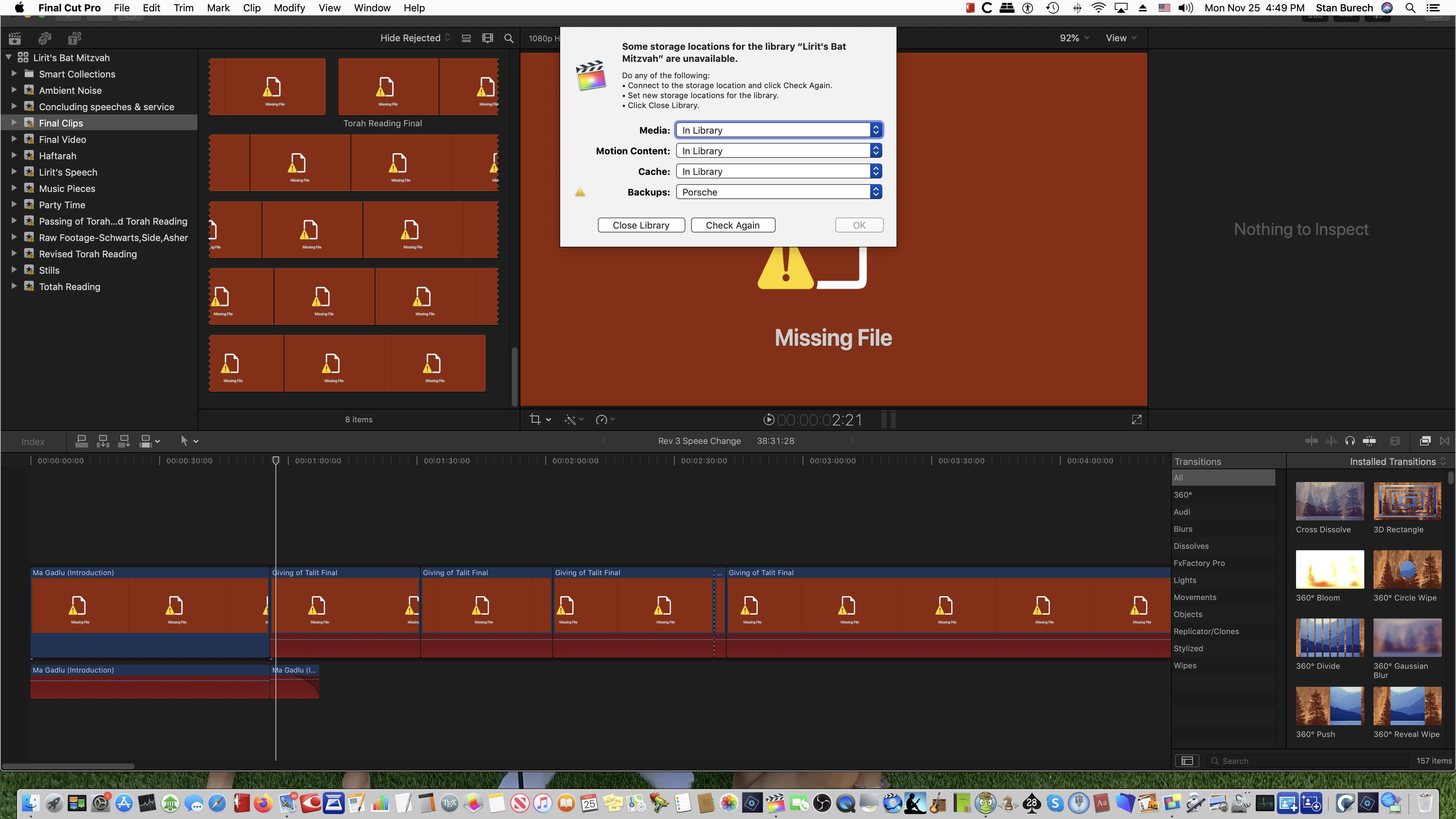 • On the right side under Media, Motion content and Caches make certain they are all “In Library” and the Backup is in the Final Cut Backups