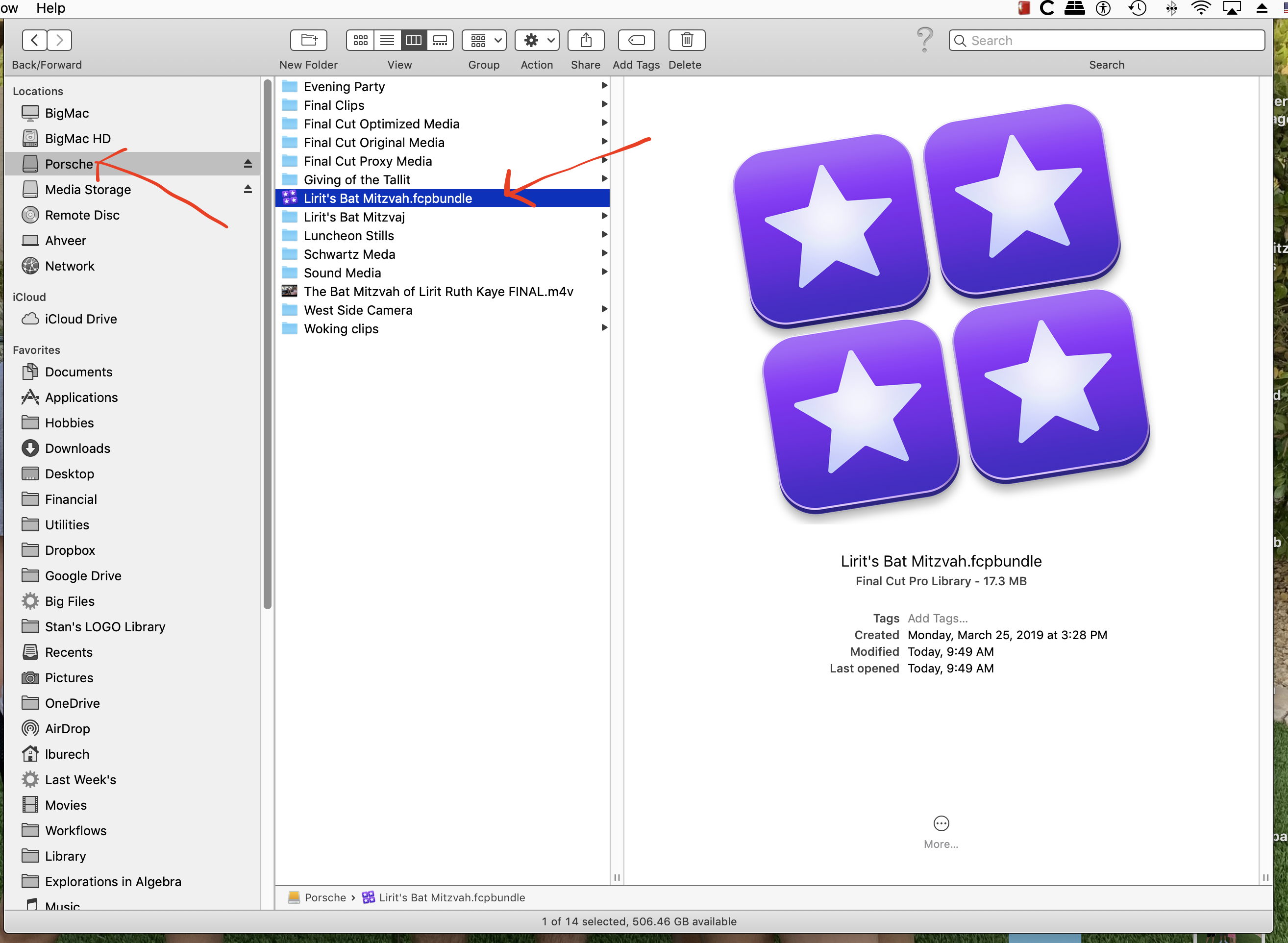Photo 2 shows where the original media (External HD 1 aka "Porsche") was located and where I dragged the FCP icon from my internal hard drive (Internal HD 3)