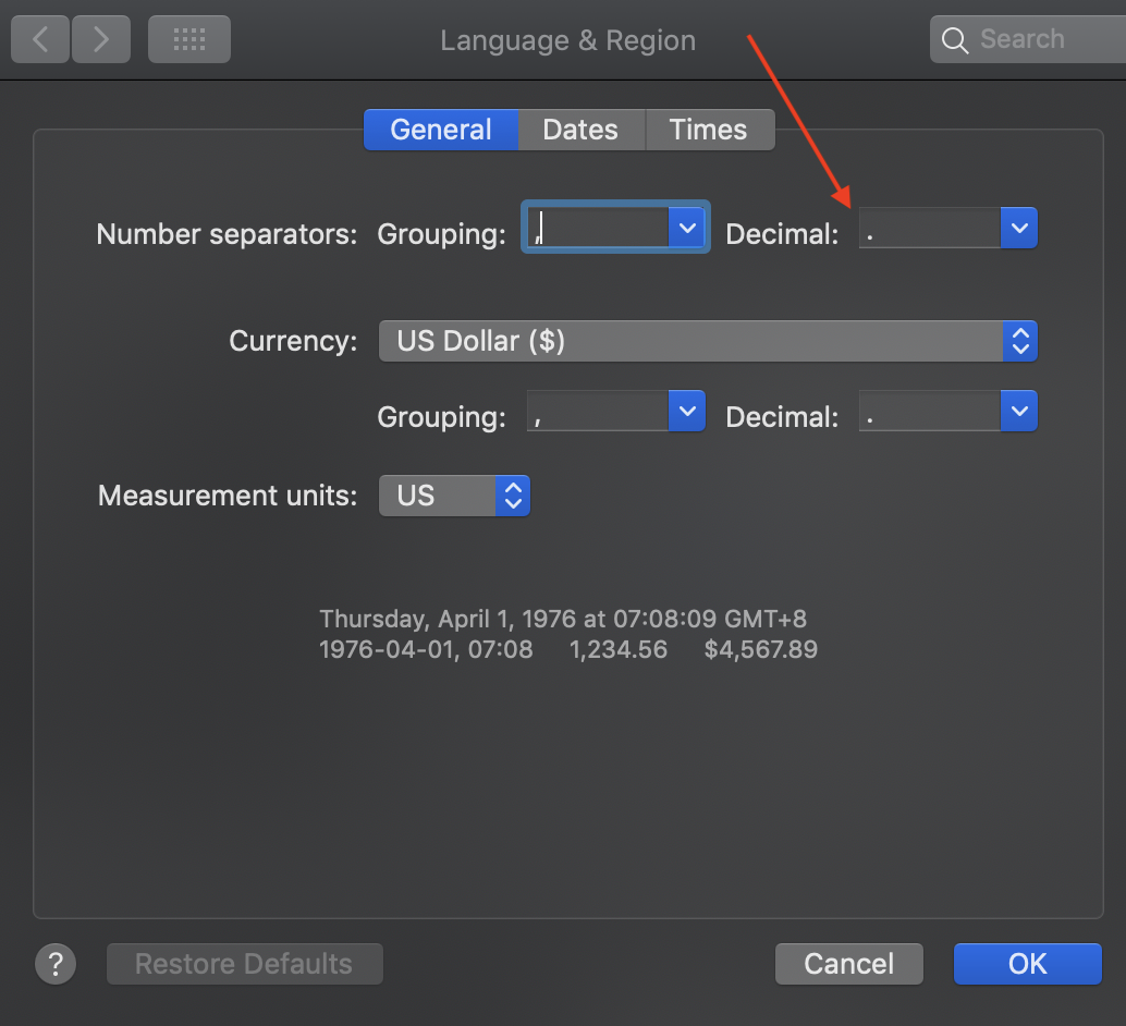 In any case, temporarily changing the delimiter in System Preferences does the trick. Hope you found that suggestion useful.