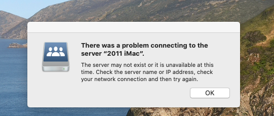 The detail in the message reads "There was a problem connecting to the server "2011 iMac" This is a holdover from transferring my data from my old computer to my new computer. "2011 iMac" is the name I gave to my old computer when it was connected to my network. Now that it has gone, something keeps looking for it - but I can't discover what is looking or how to stop it. Any suggestions?