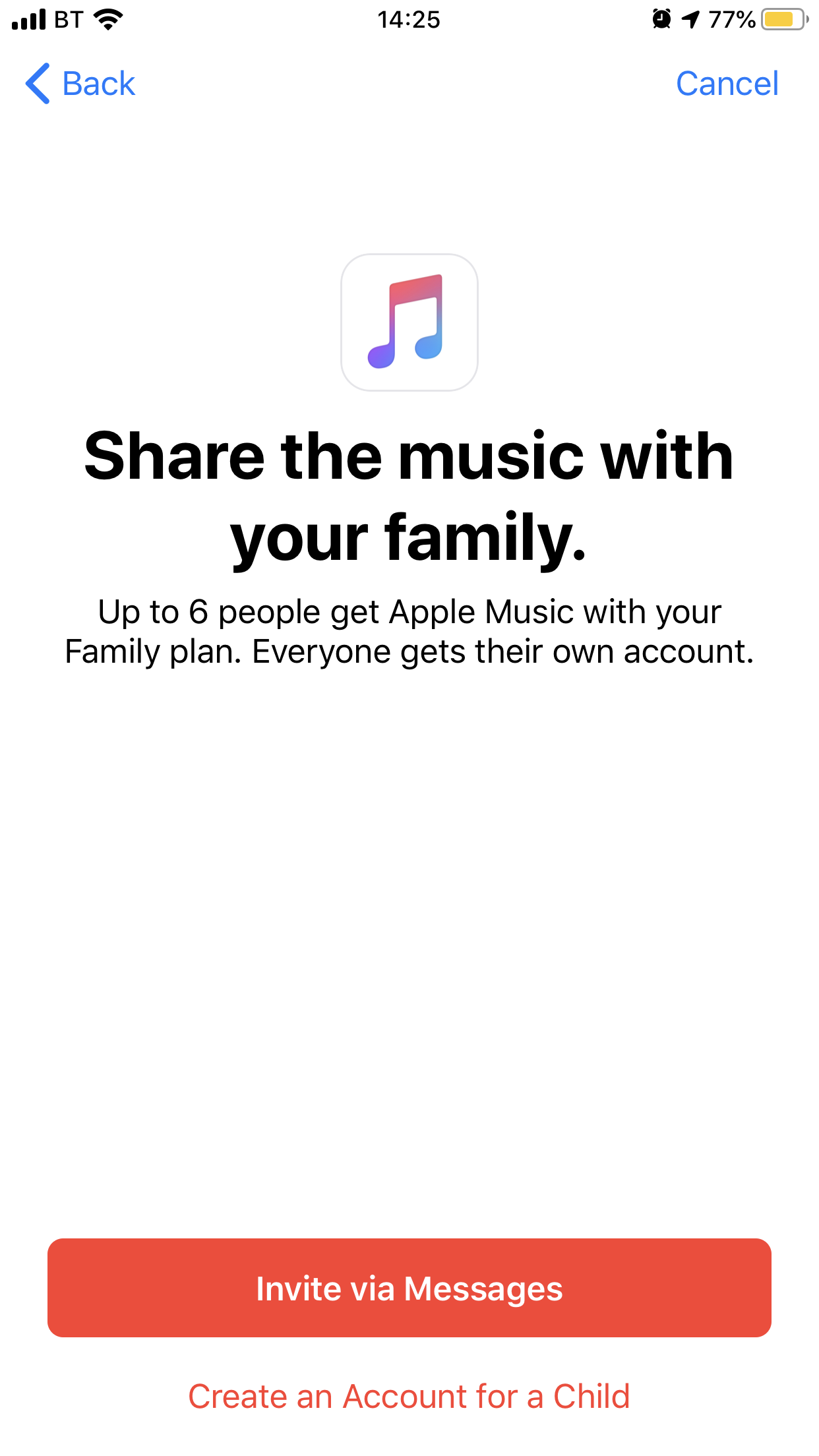 I have just upgraded my Apple Music to a family plan. The option to ‘set up family sharing’ has now appeard within my settings however when I click on it - it lets me click on ‘get started’, then ‘Apple music’. However when I then click on ‘invite via messages’, nothing happens. See photo for screenshot of the page I get upto.