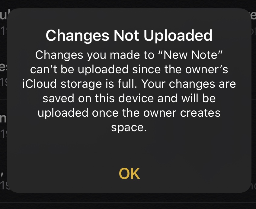 In August 2018 I created a note and shared it with several other users. It was used for a couple days then never opened again. In early October 2019 I updated my iPhone to iOS13 and every time I opened the notes app I would get a pop up saying "Changes you made to “[name of note]” can’t be uploaded since the owner’s iCloud storage is full. Your changes are saved on this device and will be uploaded once the owner creates space." I created the note. My iCloud storage is not full (I'm on a family plan with 67/200 GB used). I deleted the note but I continued to get the pop-up. The note does not even exist in Recently Deleted anymore. I recently updated my Mac to Catalina and now the desktop Notes app has started displaying the same pop-up. As a very frequent user of Notes, this is super frustrating. Has anyone else dealt with this problem?