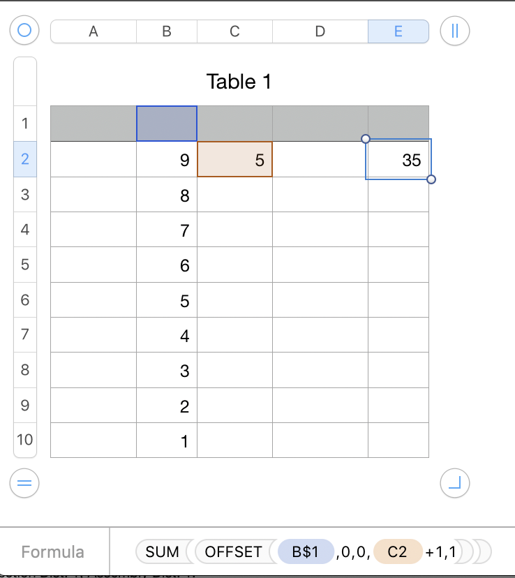 In the example above, the result in C2 should be 5, but it is starting the range at B1 instead of B2 (the result of E2 when changed to either 1 or 2 both = 9)