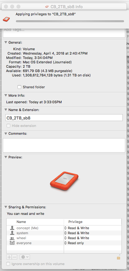 Now, for some odd reason, it sometimes asks me to authenticate with my user password when moving files from the computer Local Macintosh HD over into the Ext Hard Drive granting it permission... for any copy (Which is okay, I guess for added safety.)