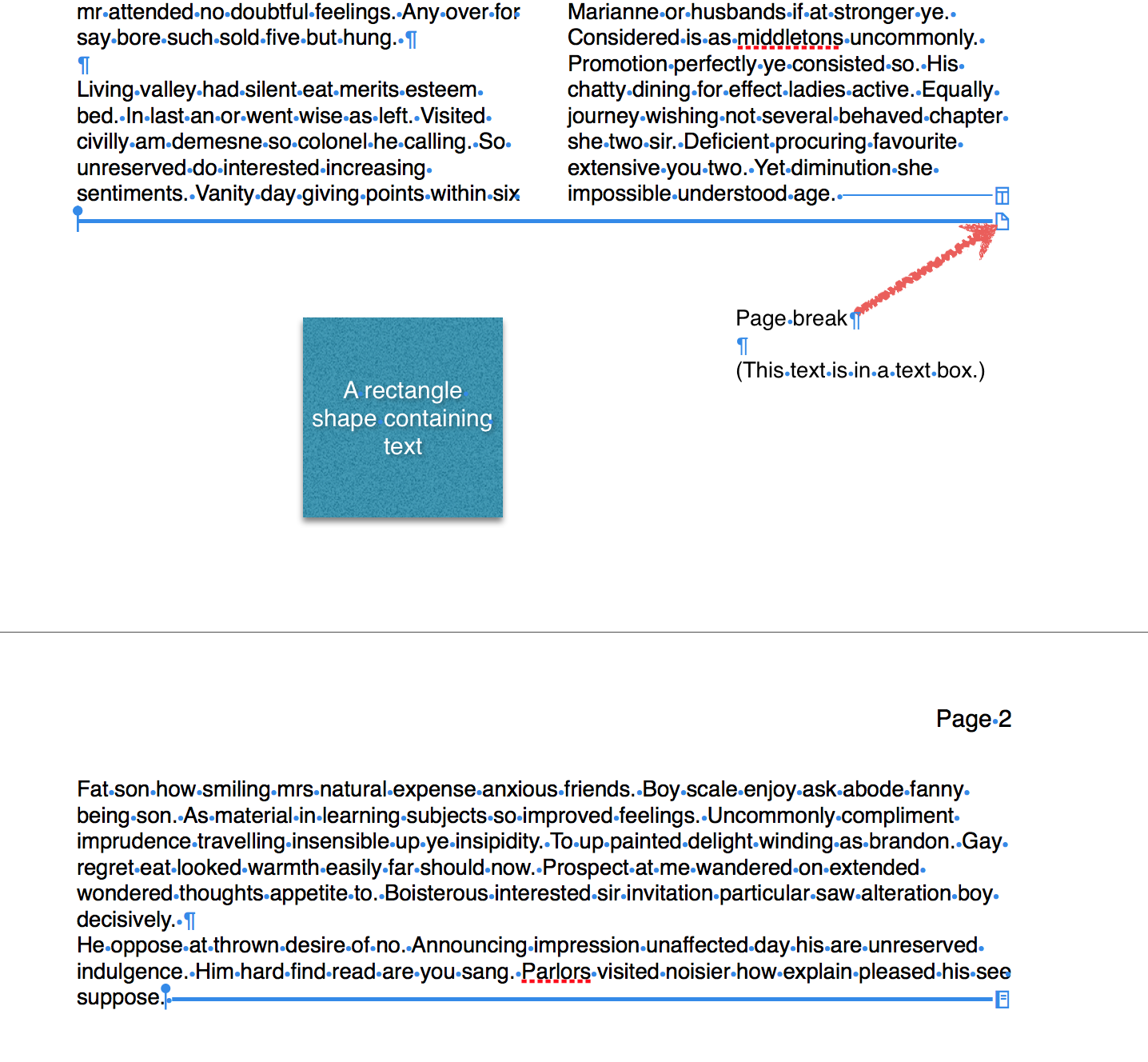In the image above, there is a page break after the word decisively (and a period and a space) on the upper page. The break forces any following text down to the next page, where you can see the insertion point immediately to the left of a blue pilcrow sign marking a 'new line'. Note also that spaces between words are made visible by the blue dots.