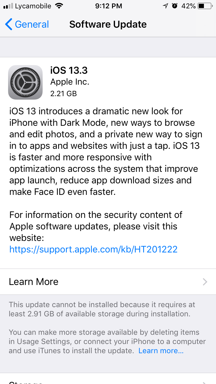 The last two paragraphs of the image you posted indicate what you need to do -- either clear up some free space on your iPhone, or update via iTunes.