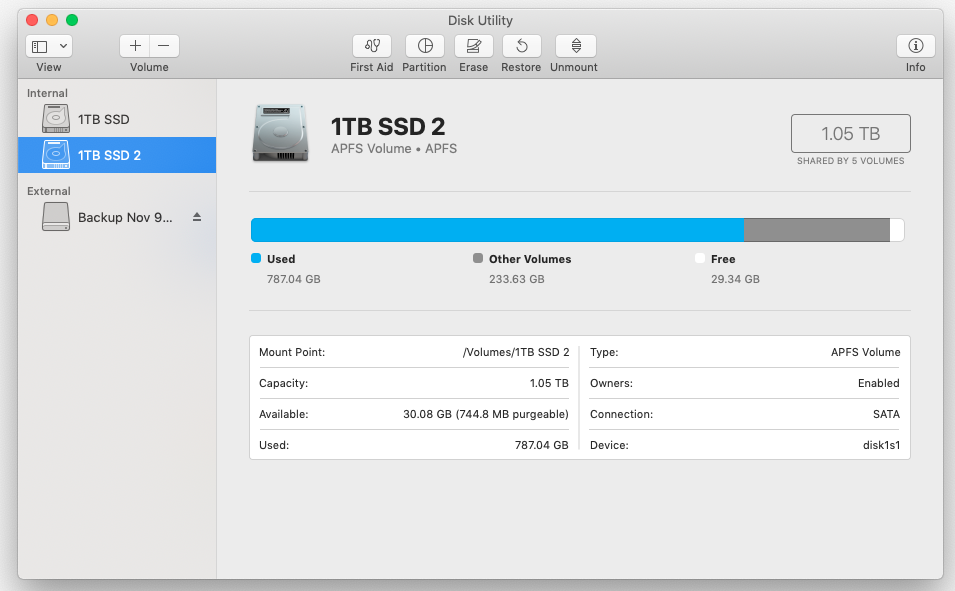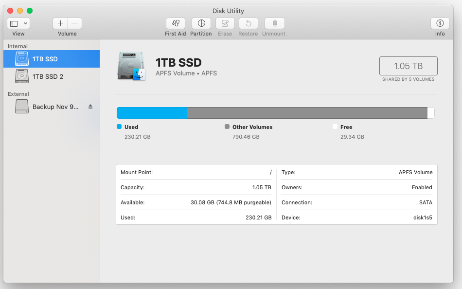 First, you need to reformat the backup disk to use HFS+. Time Machine does not work properly on APFS volumes. Second, please go to the View dropdown menu in the upper left of Disk Utility and select Show all Devices. I need to see what is shown for the Other Volumes on both disks. Third, which disk is the backup disk. Fourth, have you created more than one volume on each disk? Fifth, for the boot disk, select the volume shown under the Container in the Show all Devices listing.
